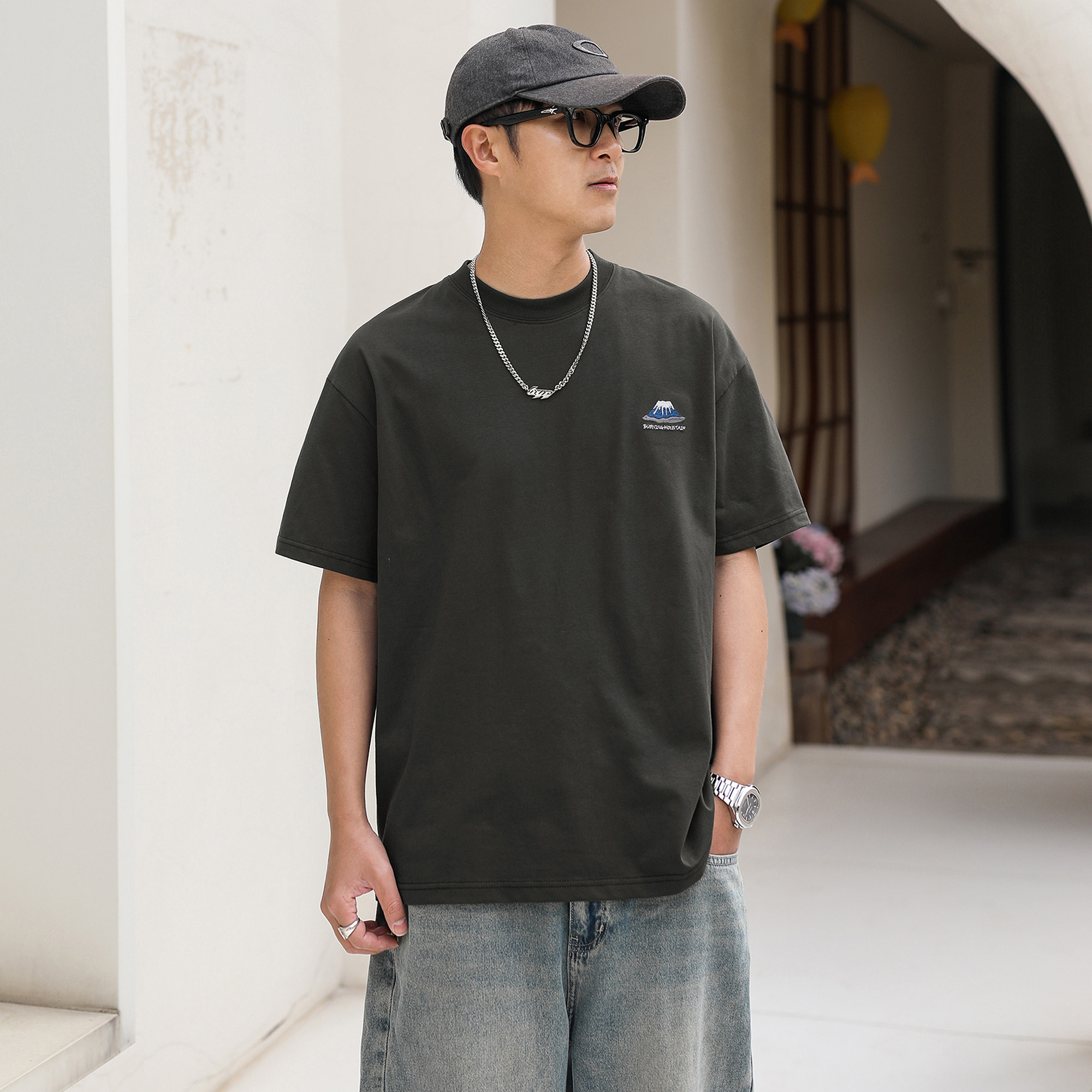 250g嘿马七作夏季新款凉感刺绣短袖T恤衫男款休闲宽松上衣半袖潮