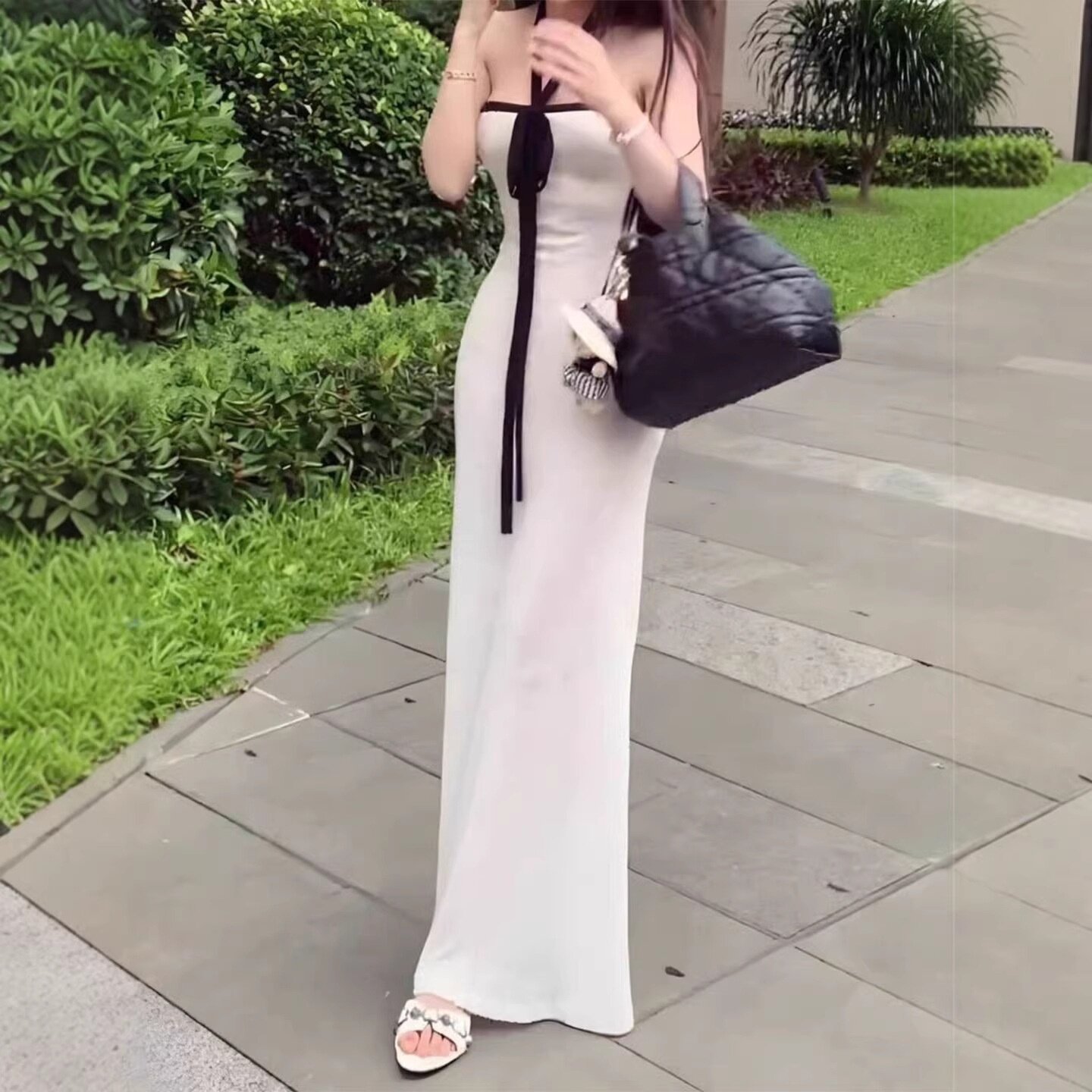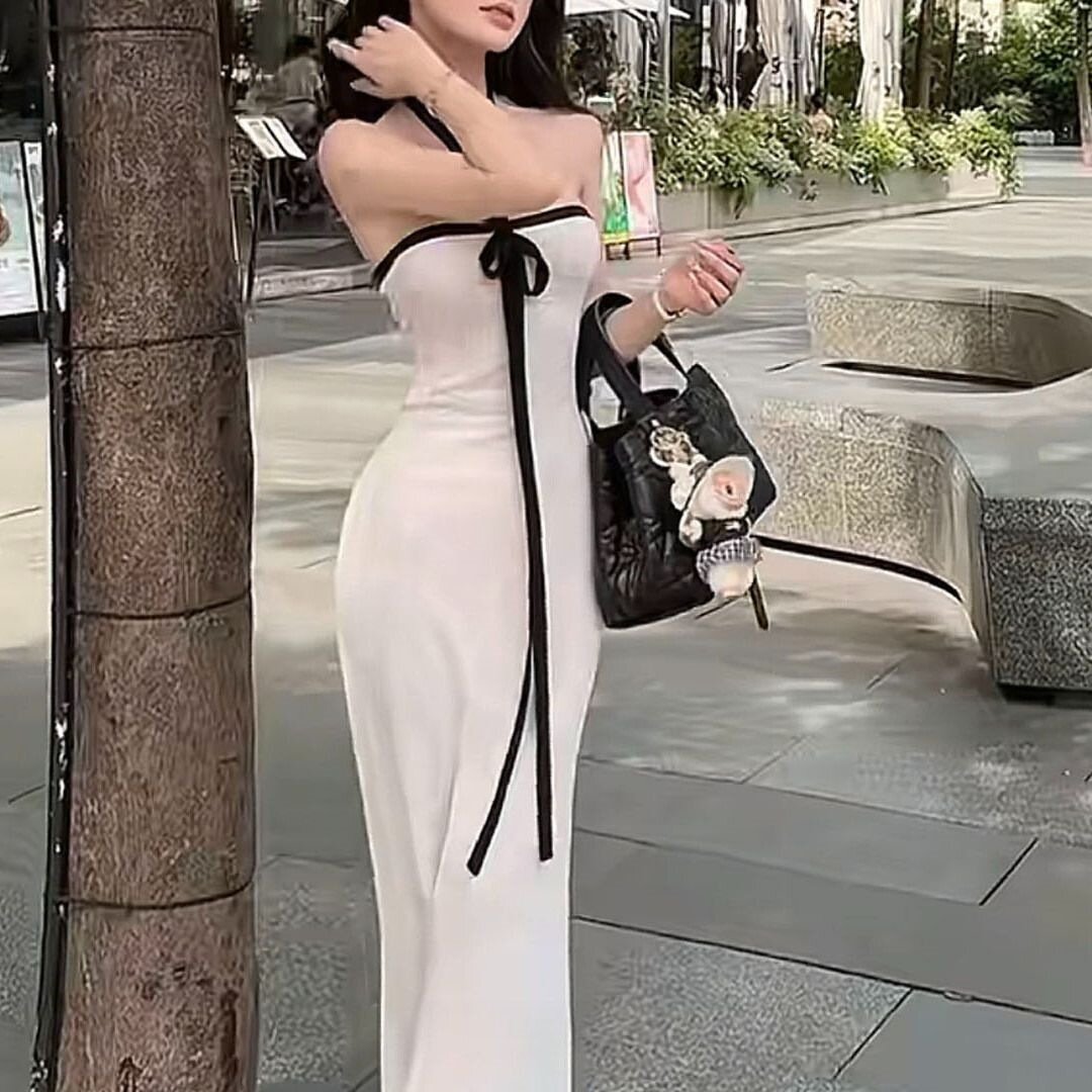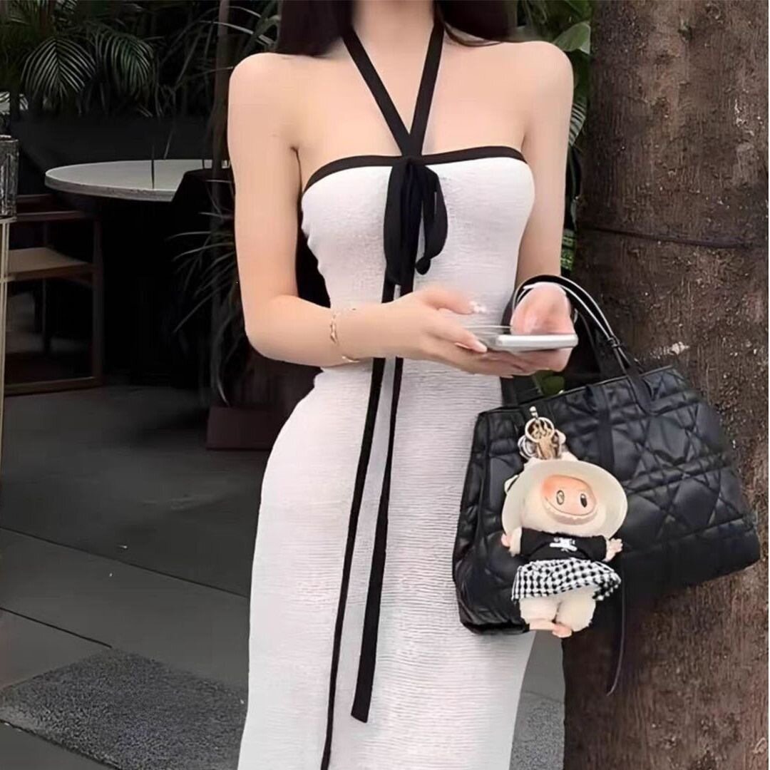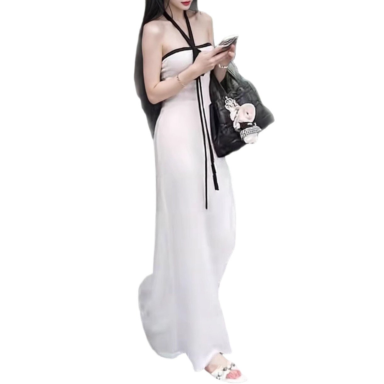 夏季气质收腰长裙性感纯欲白色露背挂脖抹胸连衣裙女海边度假裙子