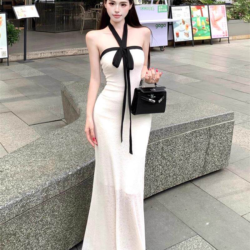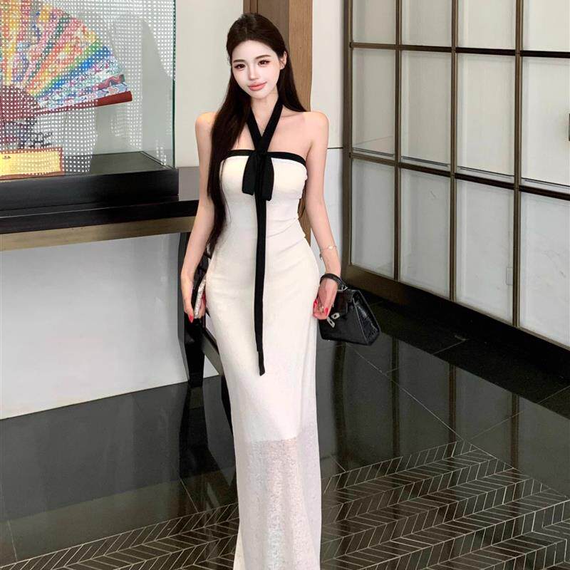 辣妹风白色挂脖抹胸连衣裙女夏季修身收腰无袖裙子显身材包臀长裙