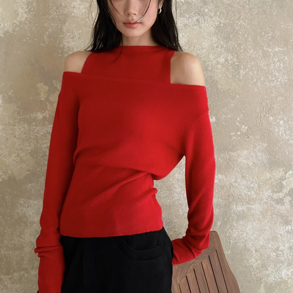 AT fashion2026早春新款红色挂脖露肩假两件针织衫女修身显瘦上衣