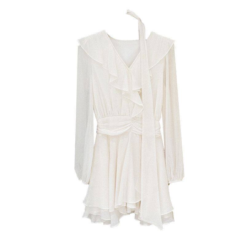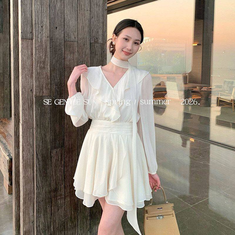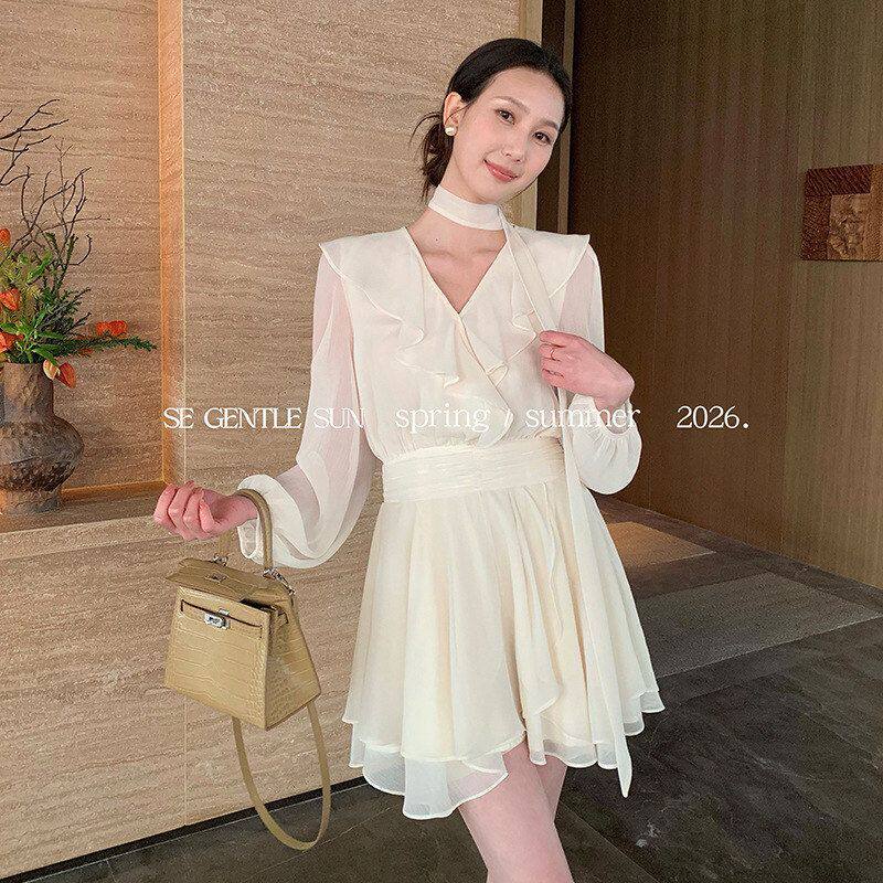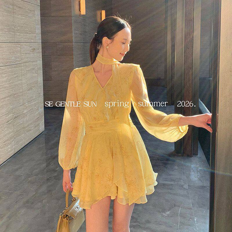秀熙熙2026春新款白标气质飘带V领雪纺长袖印花连衣裙短裙女88495
