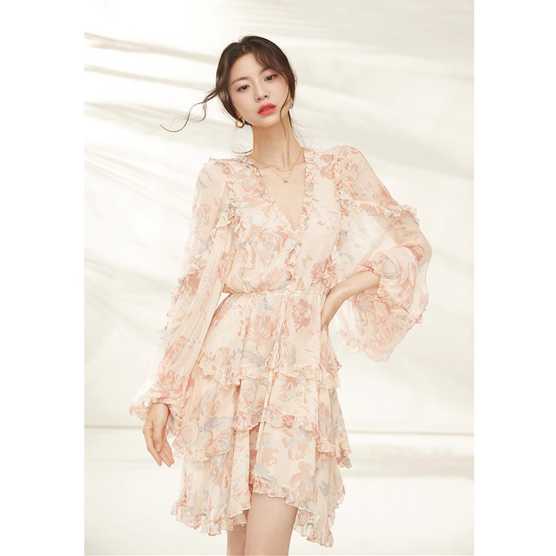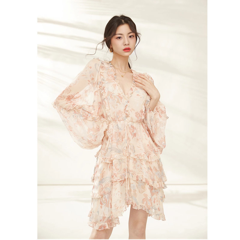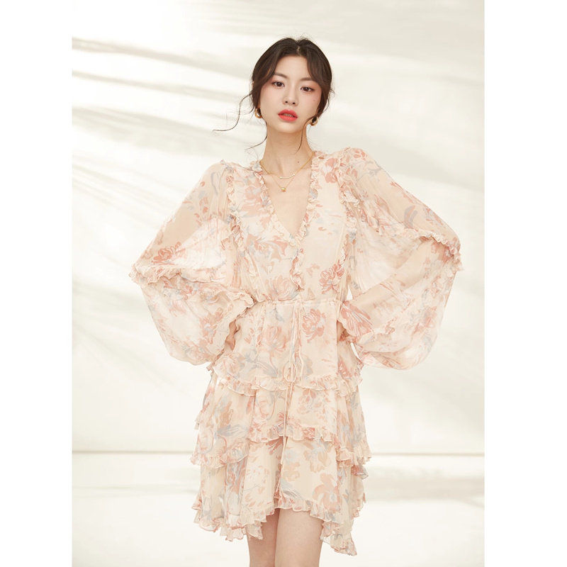 真丝碎花连衣裙女2026春夏新款小个子蛋糕裙桑蚕丝高级感超仙短裙