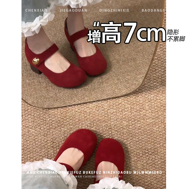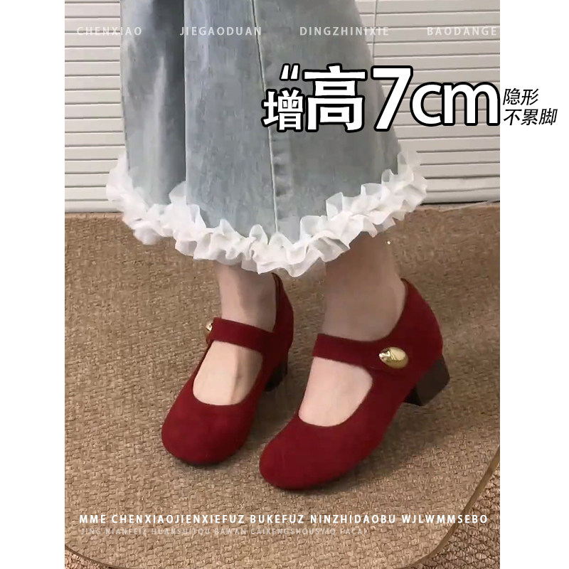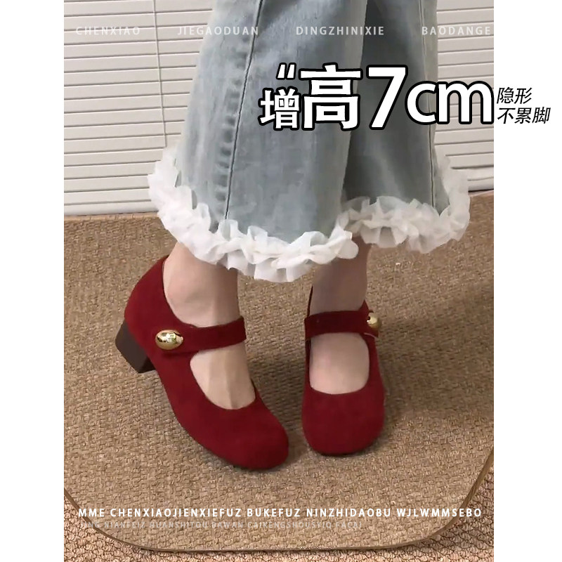 不累脚!红色内增高7CM玛丽珍鞋2026秋新款粗跟一字带浅口单鞋女