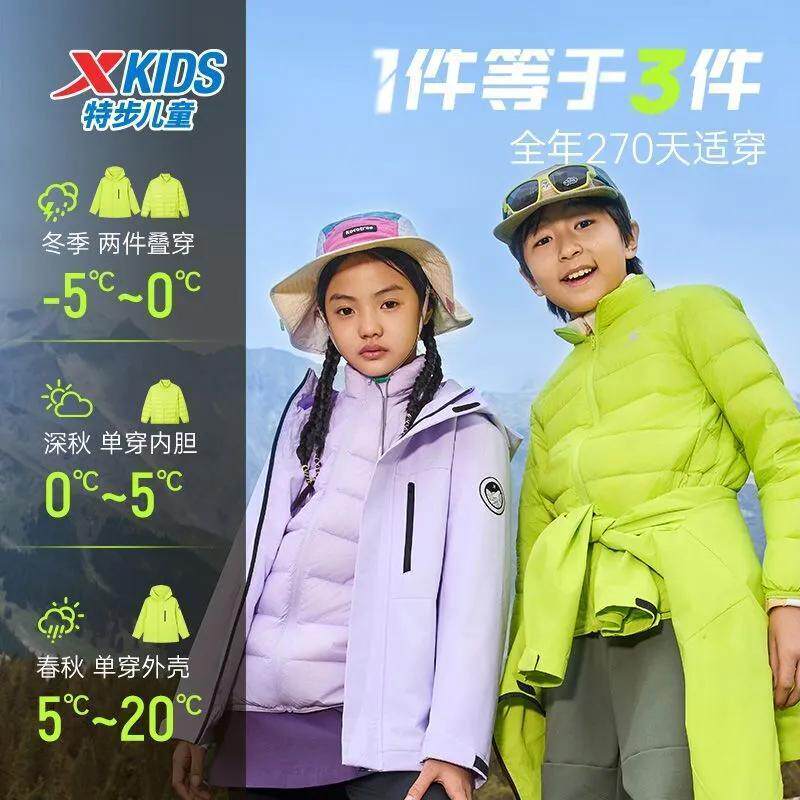 【三合一外套】特步童装2025冬季男女童保暖户外三防防风衣羽绒服