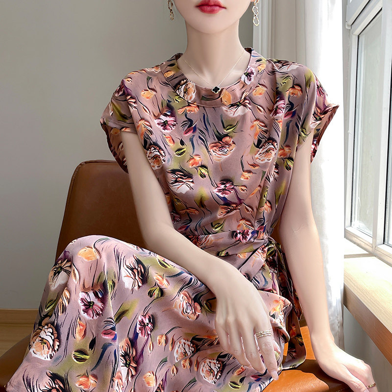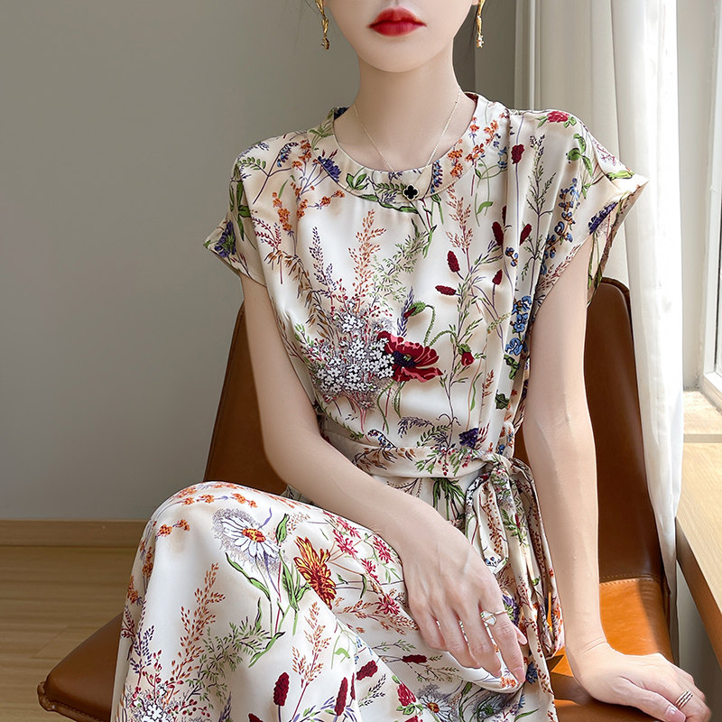 羊范醋酸缎面圆领印花连衣裙女薄款夏季新款宽松收腰系带无袖长裙