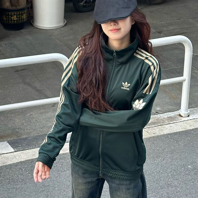 阿迪达斯三叶草绿色外套女春季新款宽松大码运动美式夹克开衫上衣
