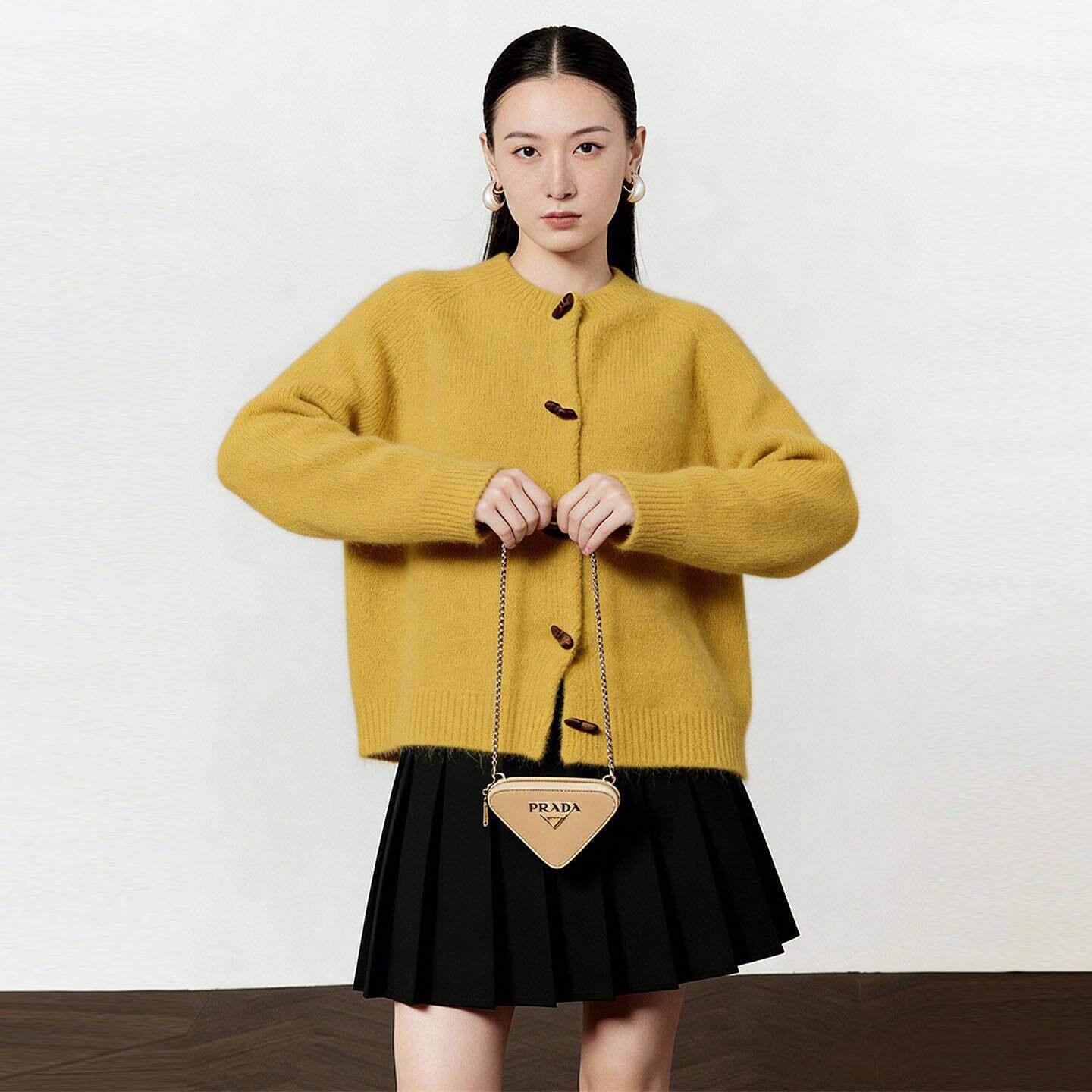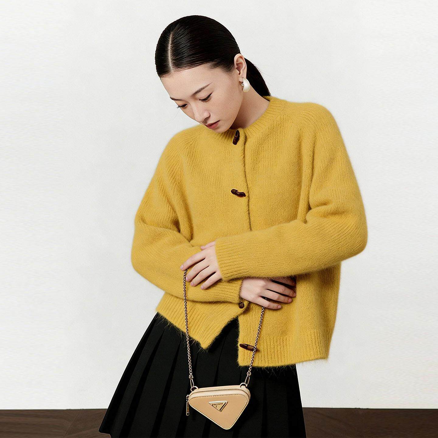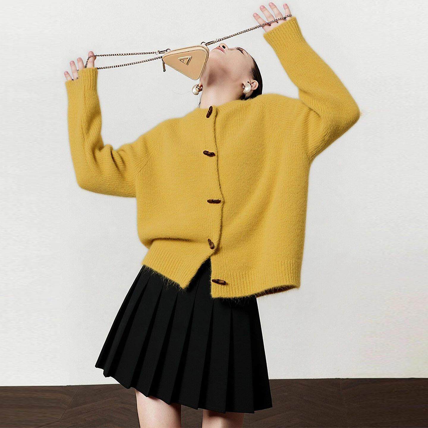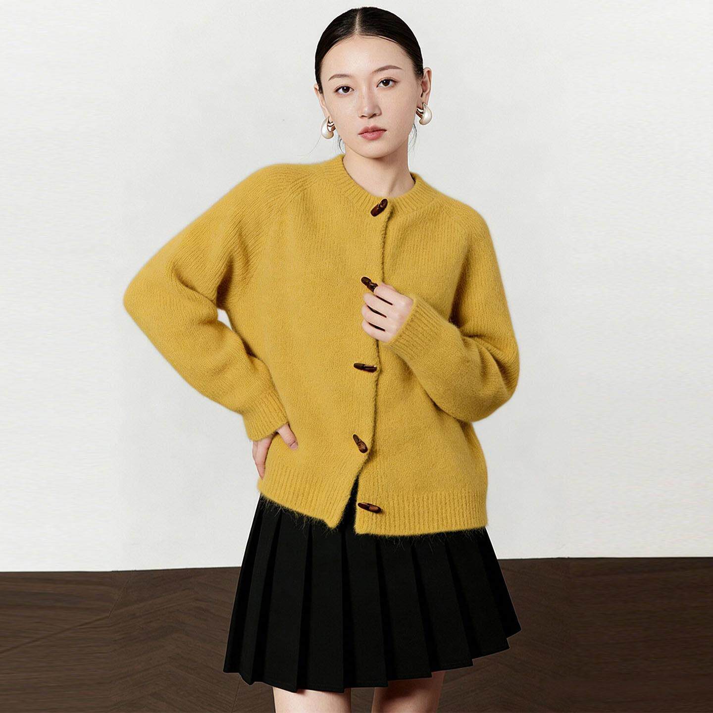 黄色牛角扣圆领针织开衫毛衣外套女款2026新款冬季慵懒高级感穿搭
