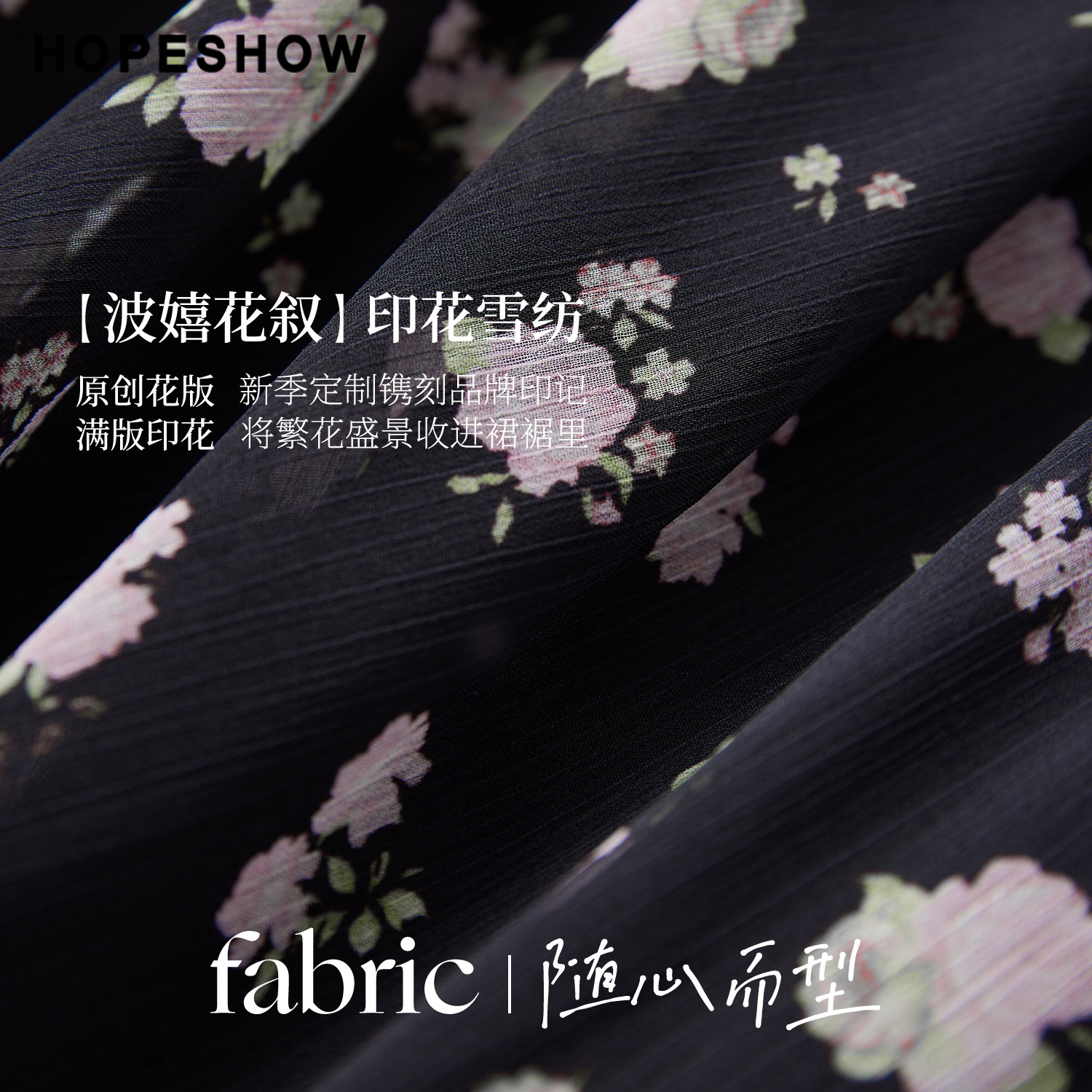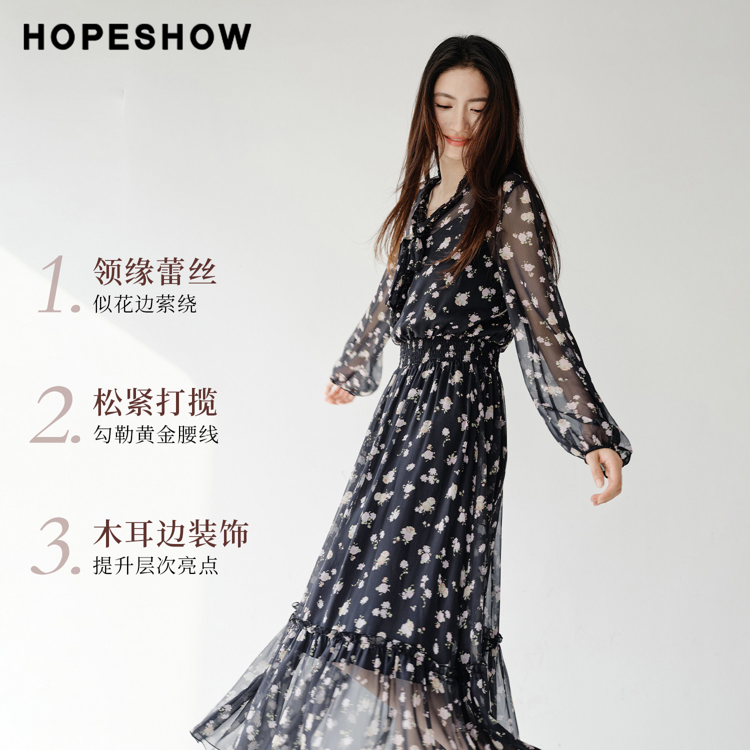 红袖2026春季新款女装 花卉印花蕾丝拼接系带打揽长袖雪纺连衣裙