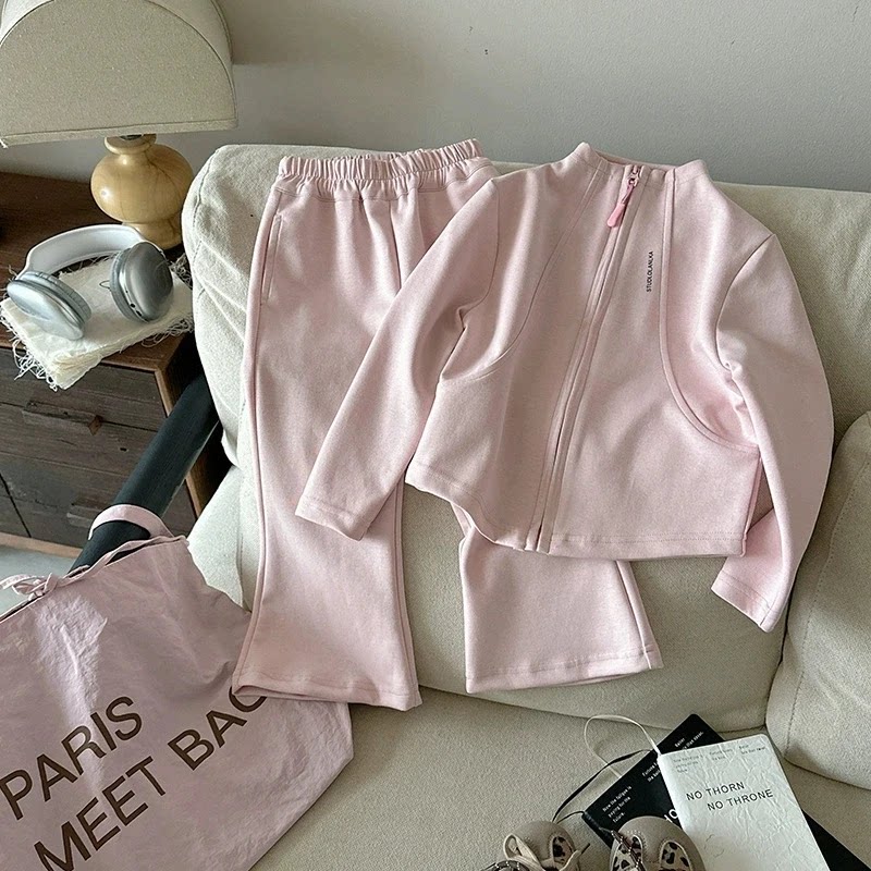 女童春秋款卫衣套装2026女宝宝韩版拉链短款外套儿童喇叭裤两件套