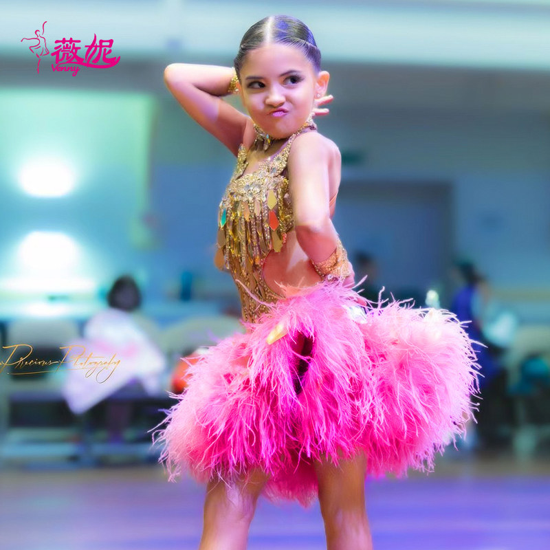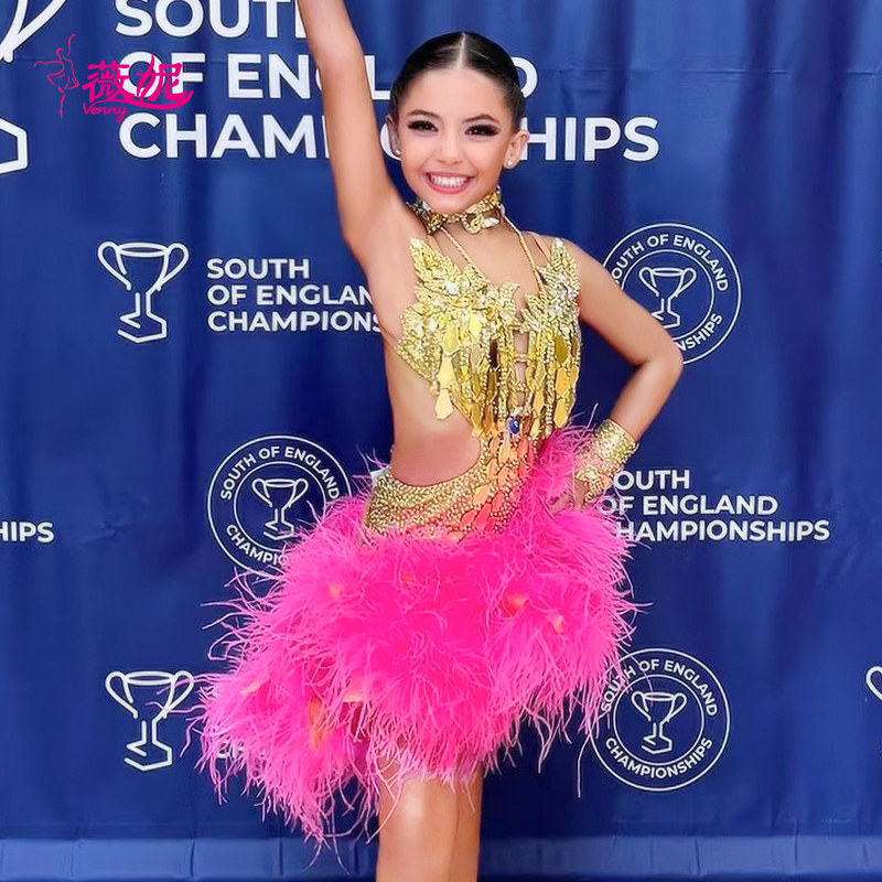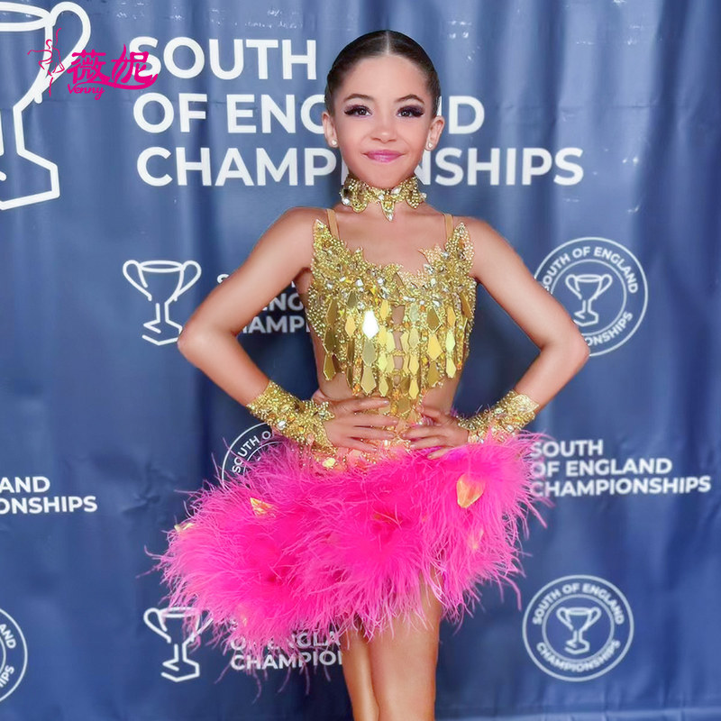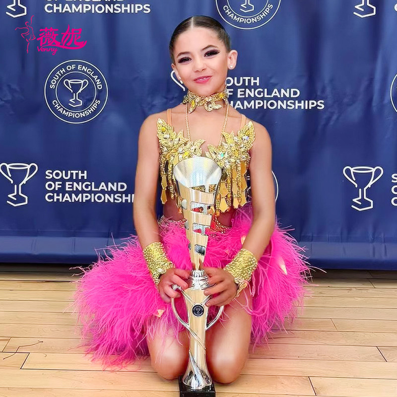 薇妮拉丁舞比赛演出服吊带钻服羽毛半裙设计感花服女12岁14岁以上
