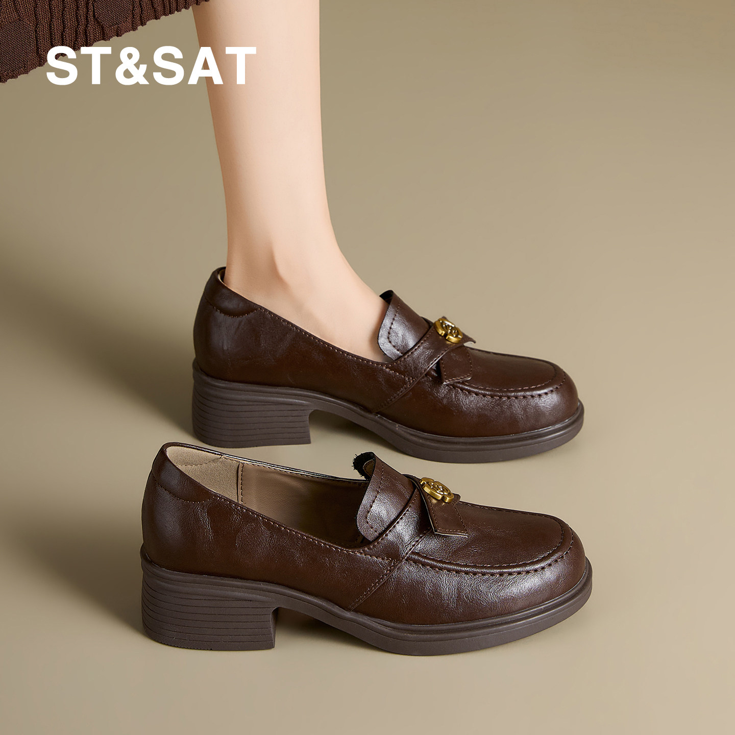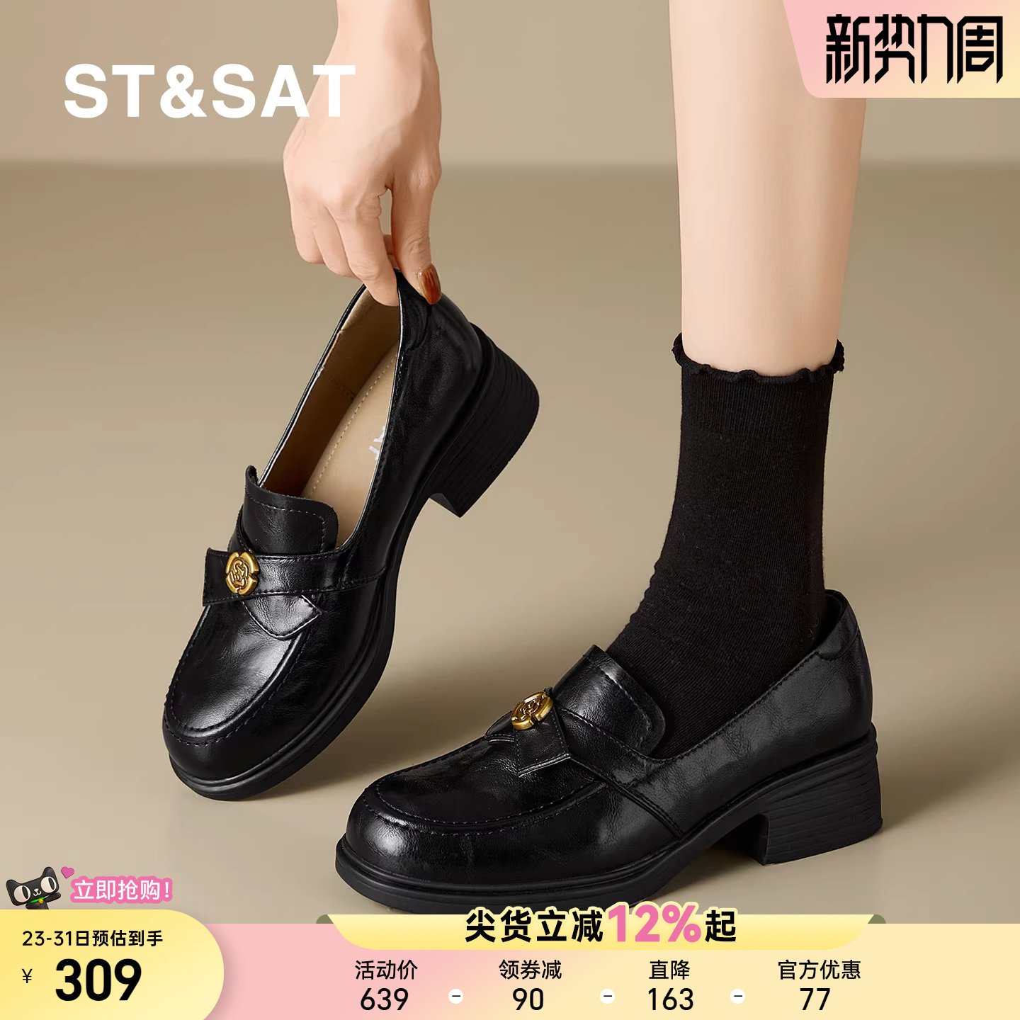 星期六新款厚底单鞋女春季山茶花真皮圆头小皮鞋英伦风百搭乐福鞋