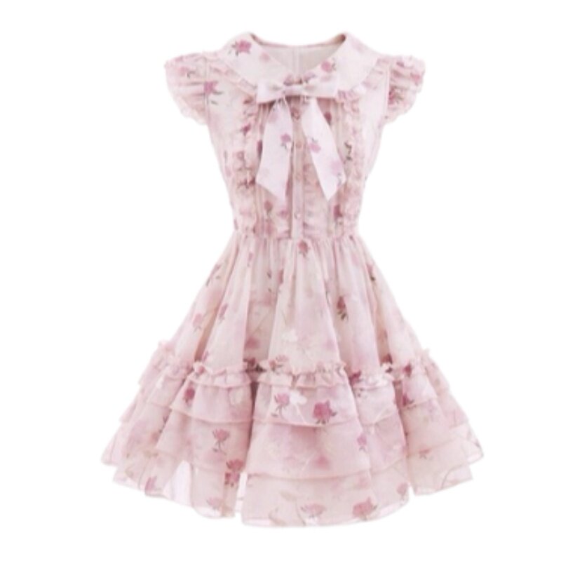 大码胖mm甜美蝴蝶结娃娃领碎花收腰蓬蓬连衣裙女春夏显瘦公主短裙