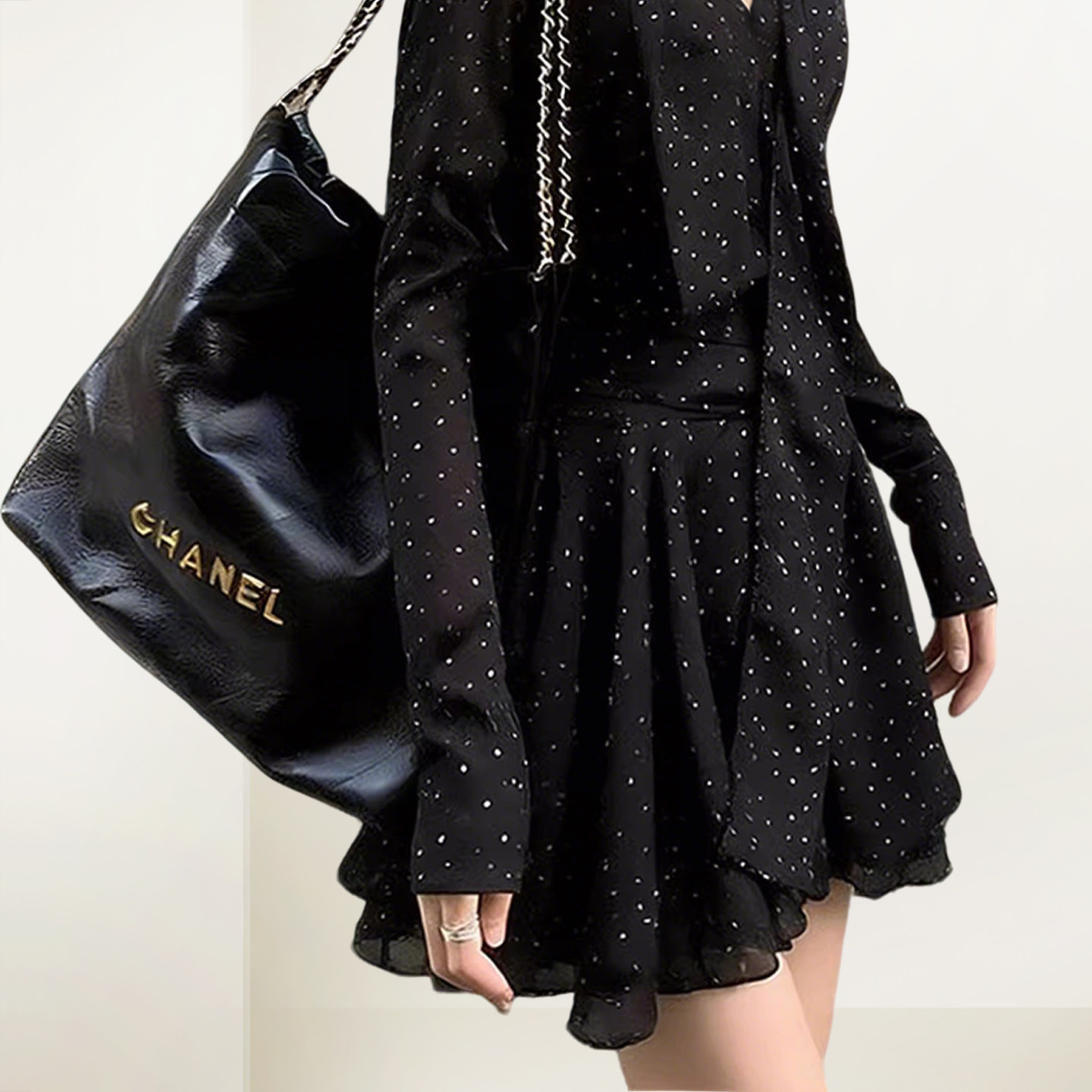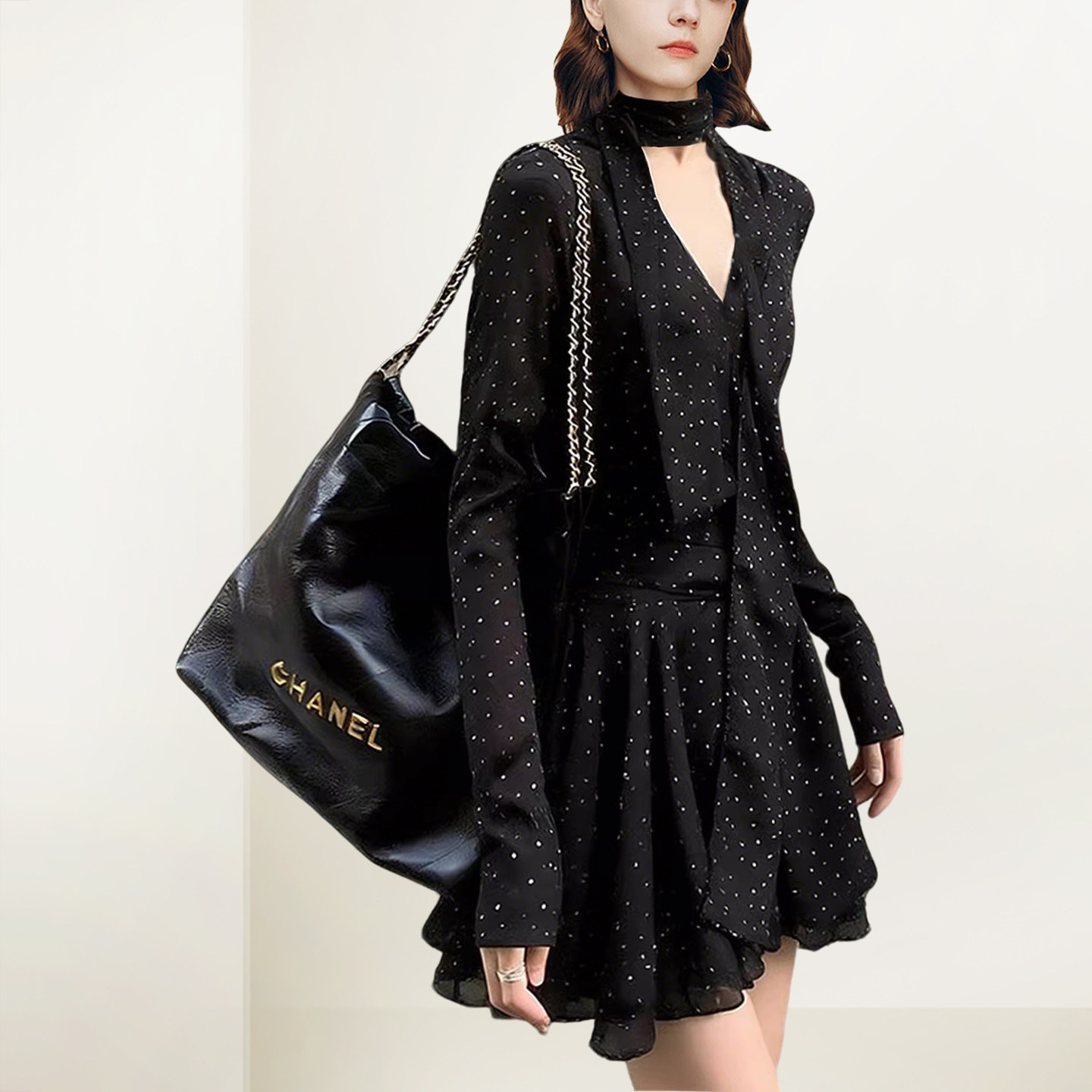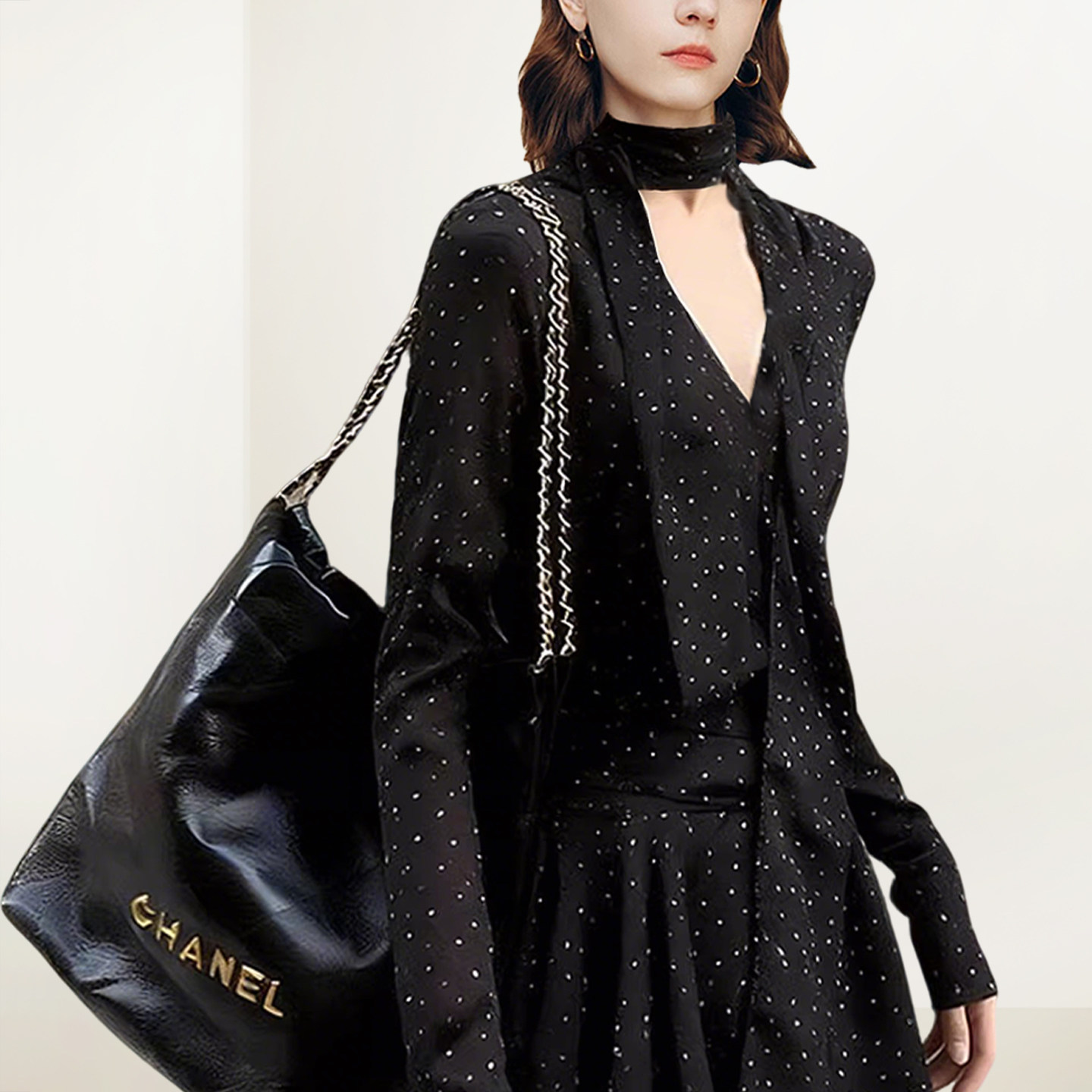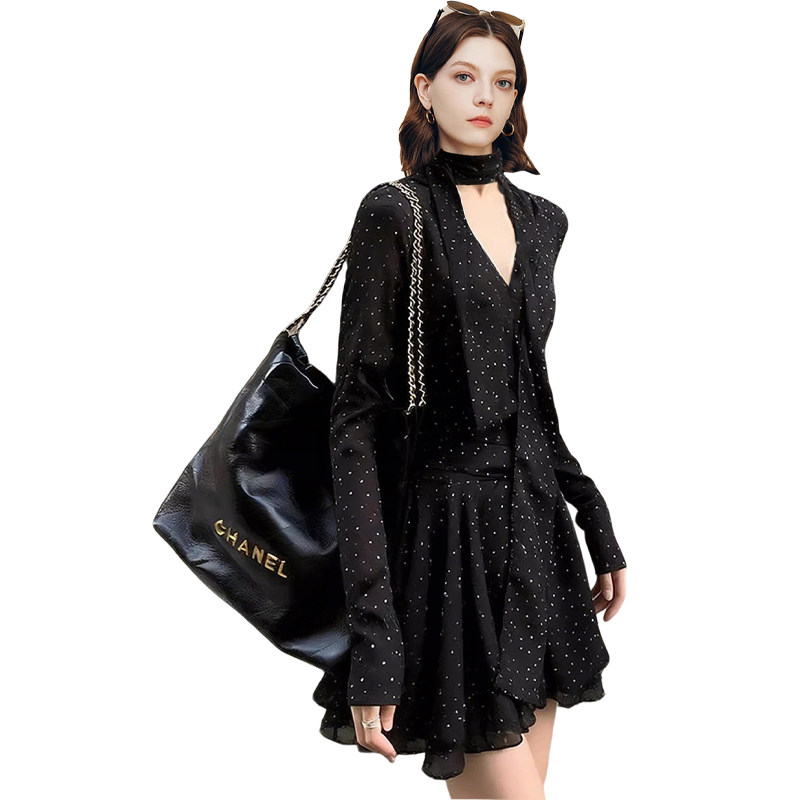 QOOEL设计感黑色波点连衣裙女2026春季新款长袖V领收腰气质中长款
