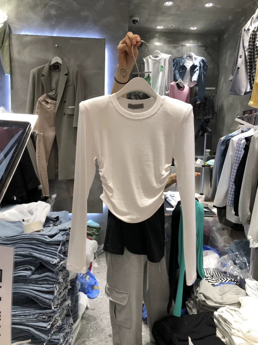ADD东大门2026早春新款纯色褶皱修身显瘦垫肩长袖T恤女短款上衣