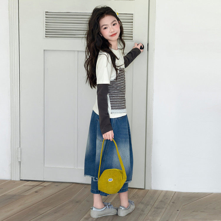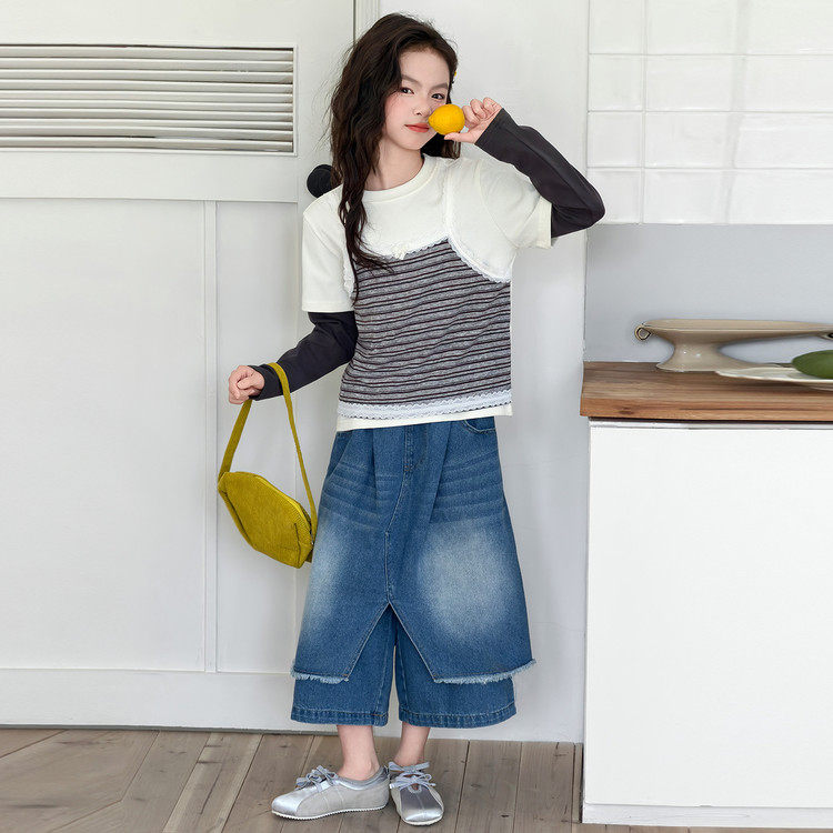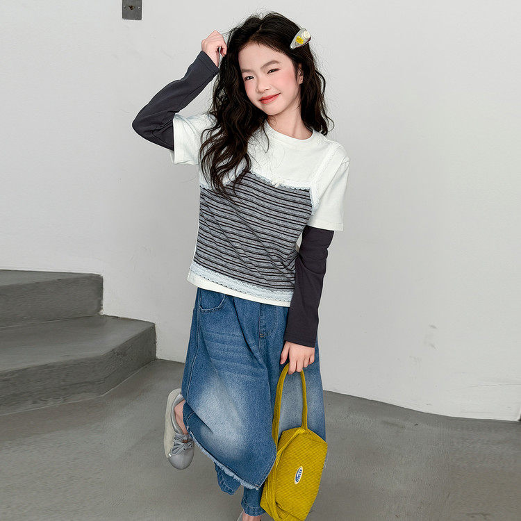 女童网红炸街套装春季2026新款中大童女装长袖假两件T恤牛仔裙裤