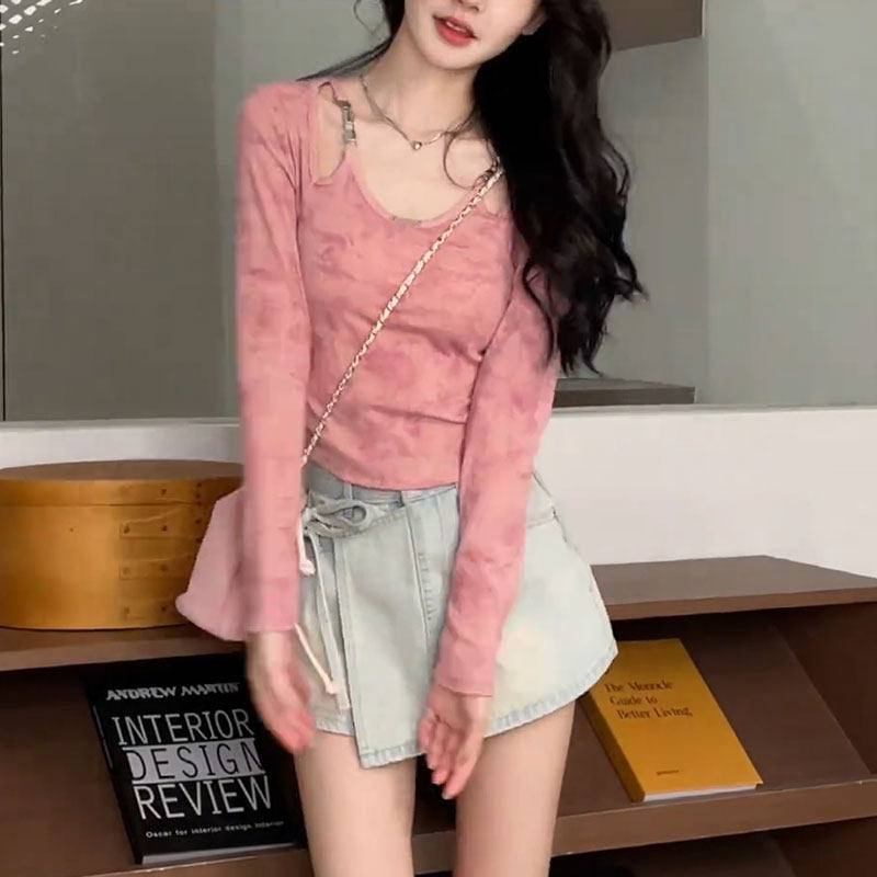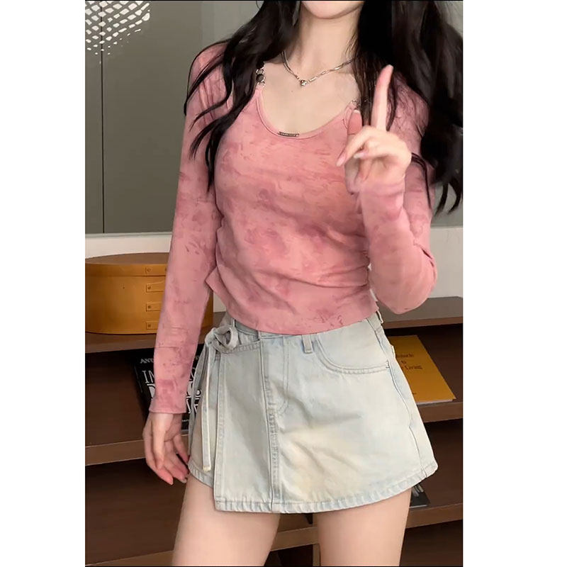 2025年早春新款微胖设计高级感显瘦短款长袖V领百搭T恤褶皱上衣潮