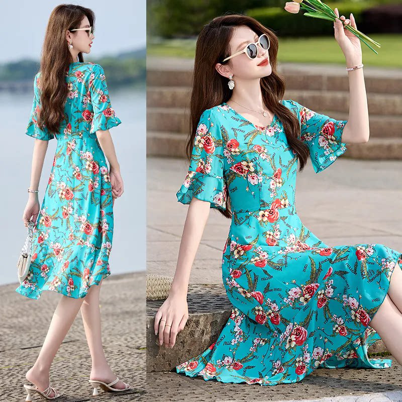 夏气质新款大码女装300斤裙子2025优雅显瘦修身中长款碎花连衣裙