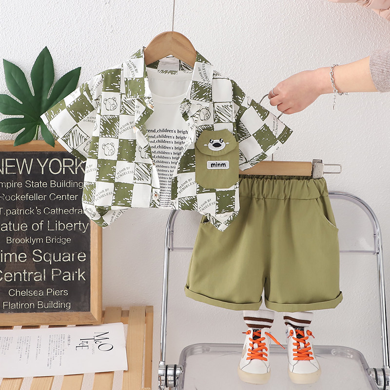 男童洋气时髦衬衫短袖三件套装宝宝帅气衬衣婴儿童休闲短袖韩版潮