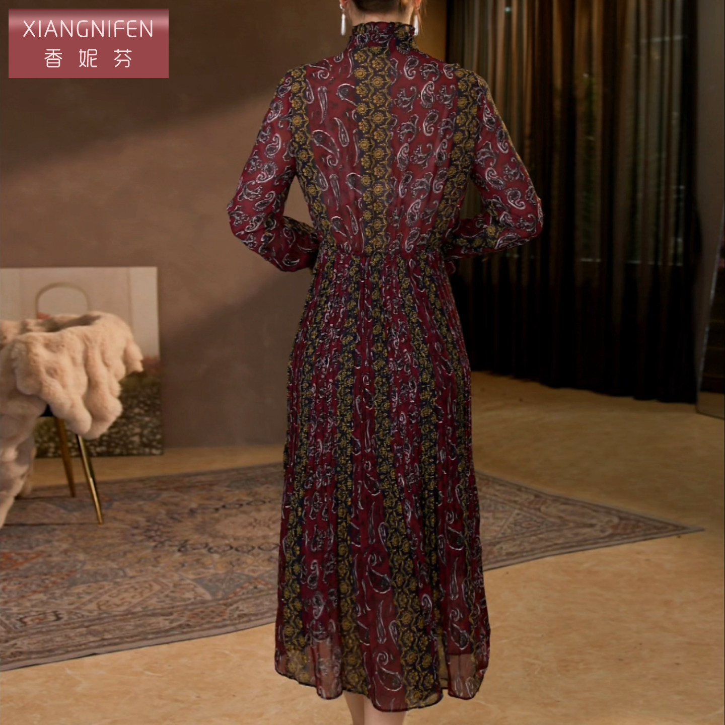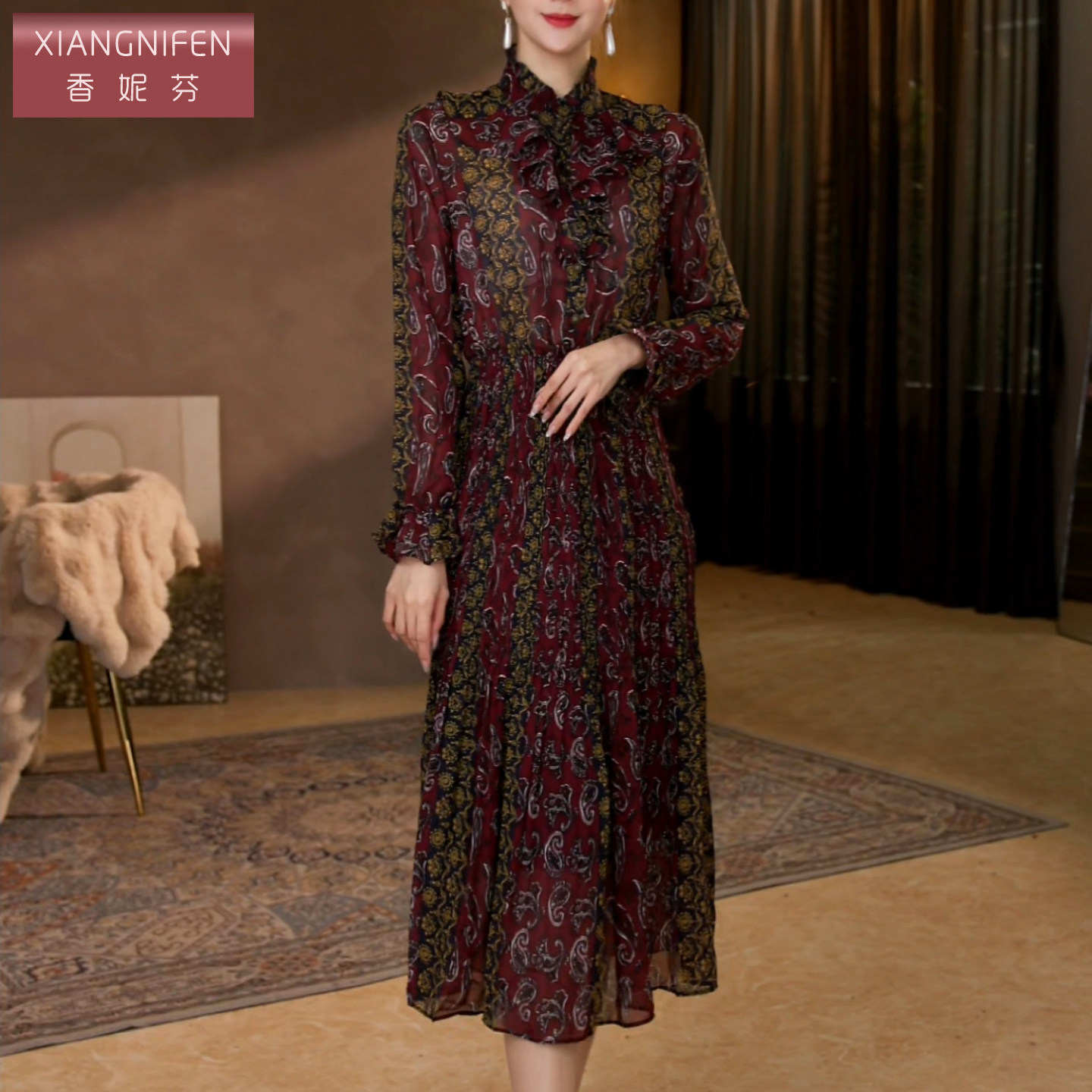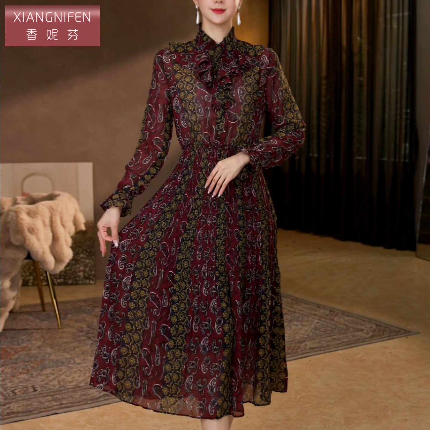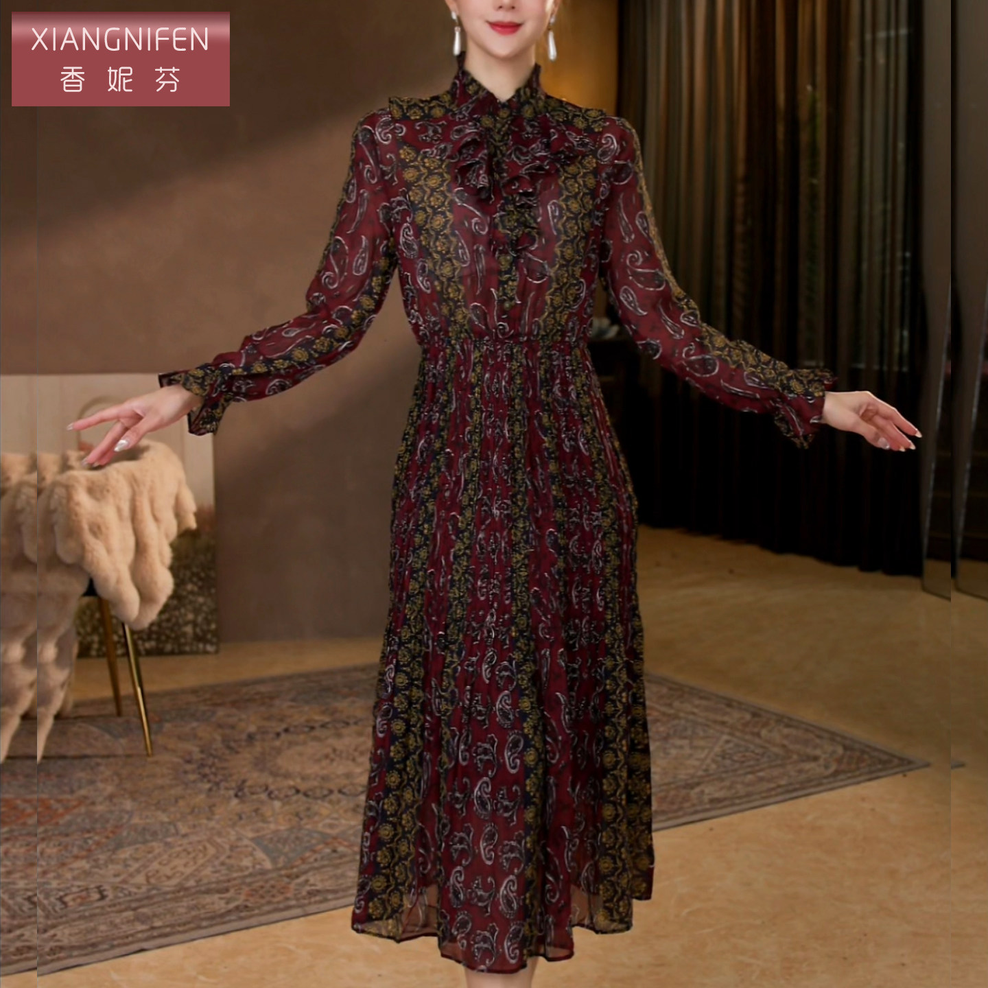 香妮芬[清仓特价]优雅气质中年妈妈连衣裙长袖收腰显瘦女士中长裙