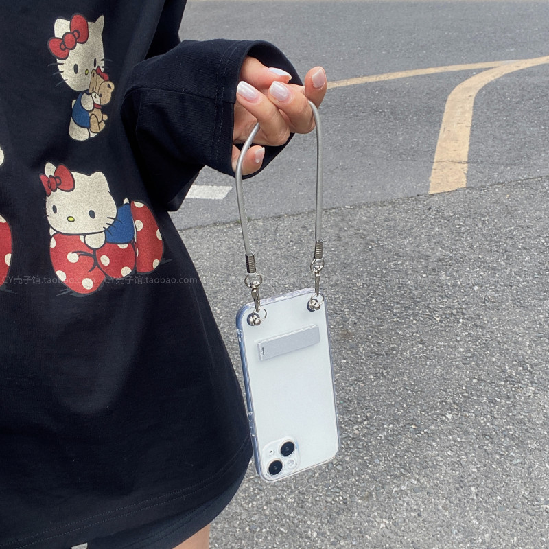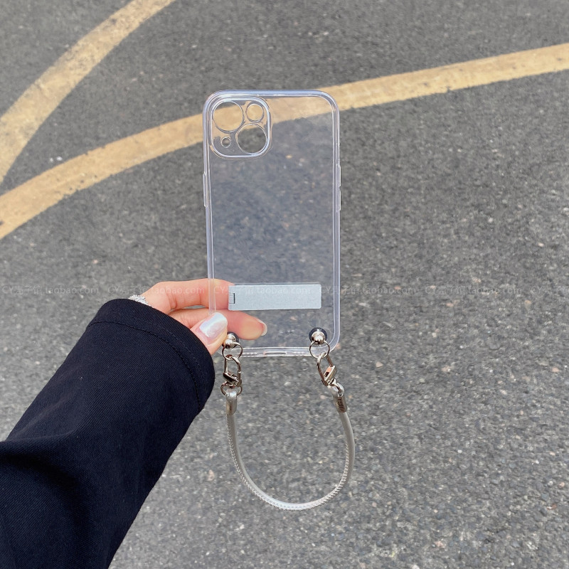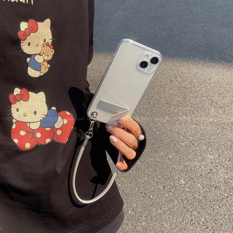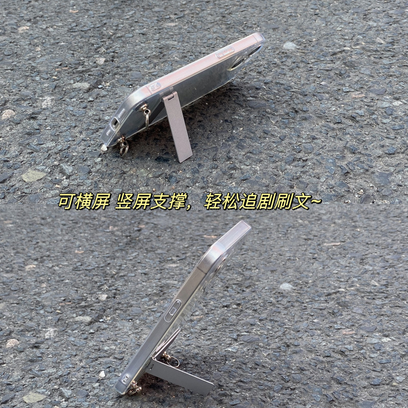 ins冷淡风高级感银色手提绳适用苹果17ProMax透明手机壳iPhone16promax简约折叠支架15pro小众14腕带13保护套