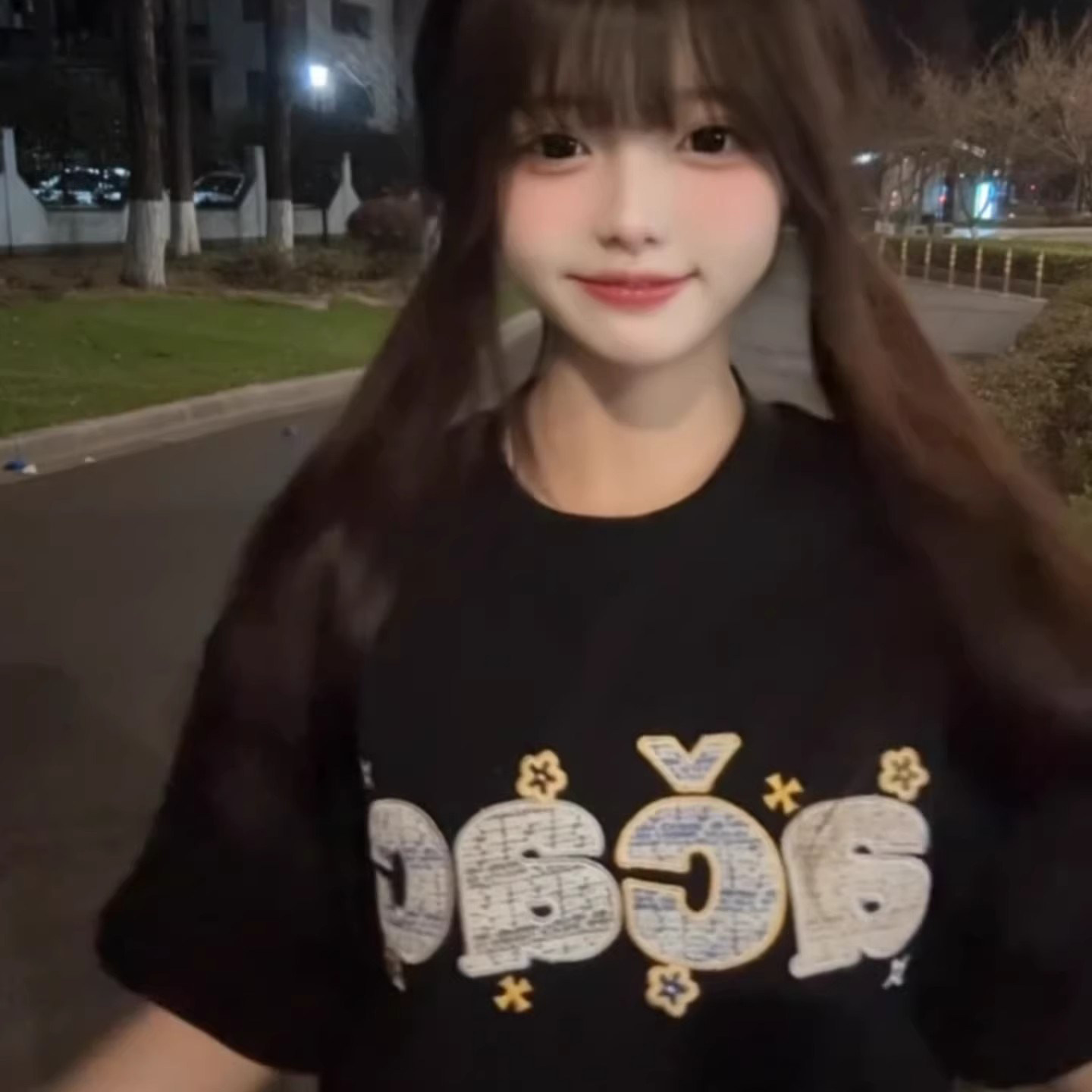 美式高街黑色重工刺绣字母短袖T恤女大童初中高中学生宽松上衣