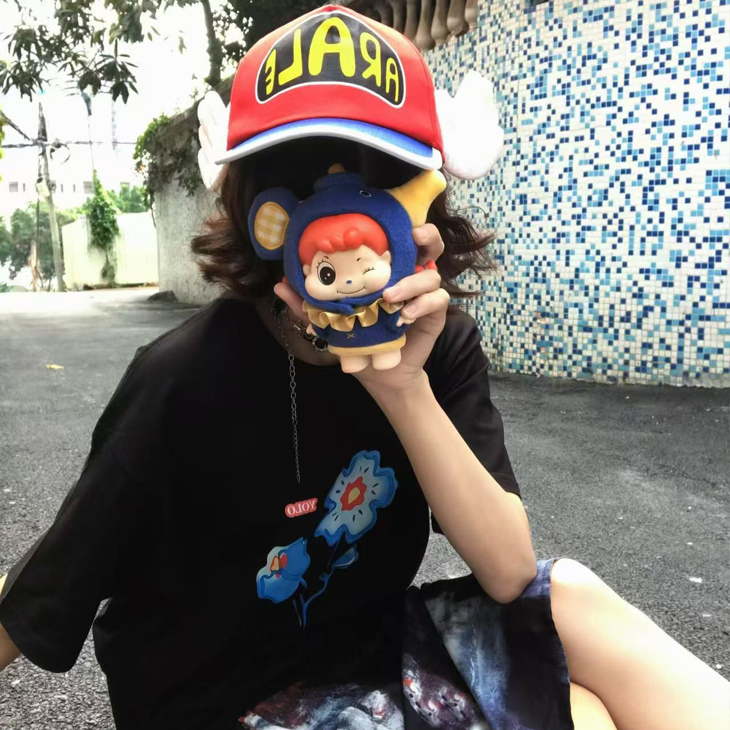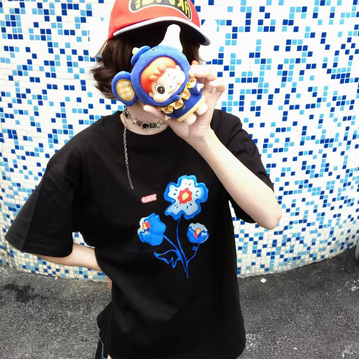 黑色短袖T恤女大童初中高中学生花朵印花宽松版型个性潮酷上衣