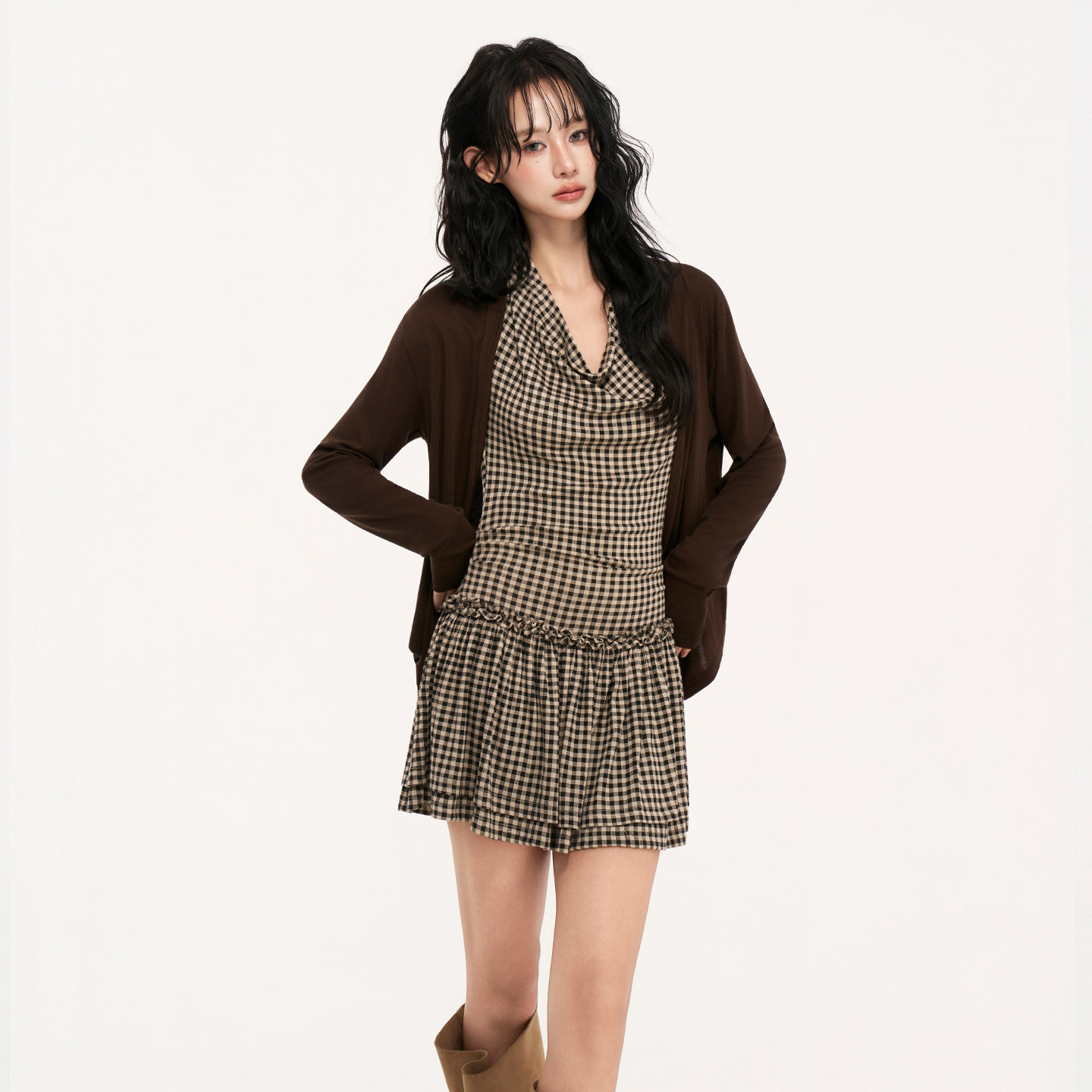 AXIA 木耳边拼接格纹短款连衣裙女纯欲辣妹修身收腰百褶a字裙子