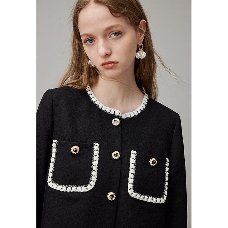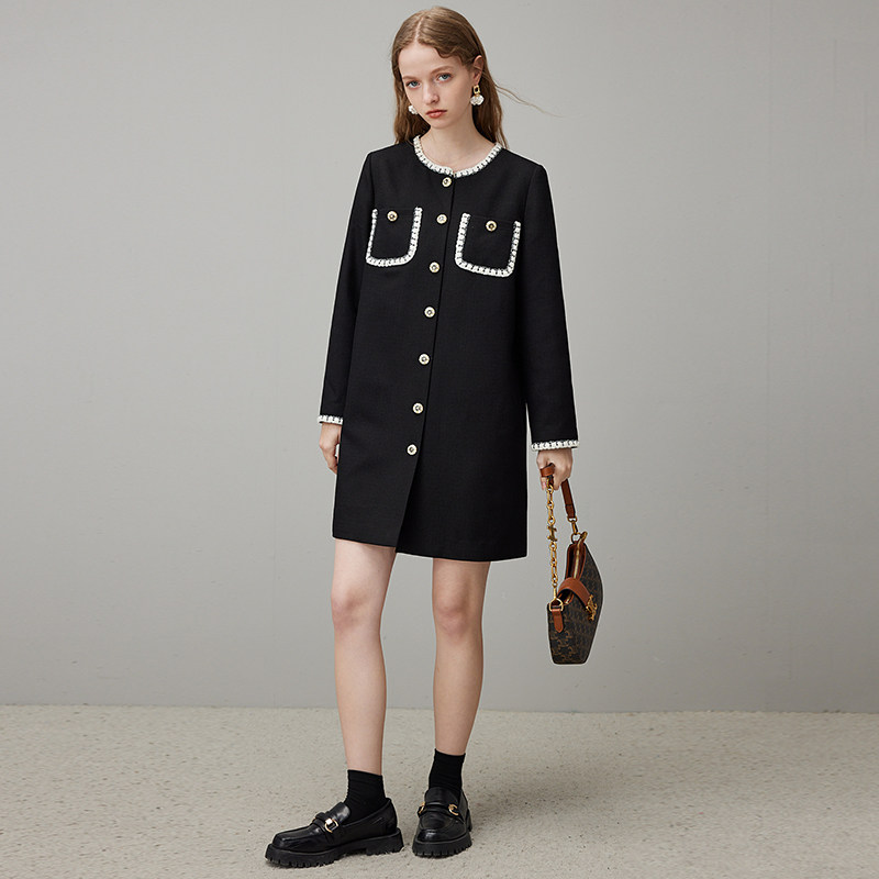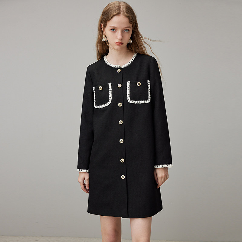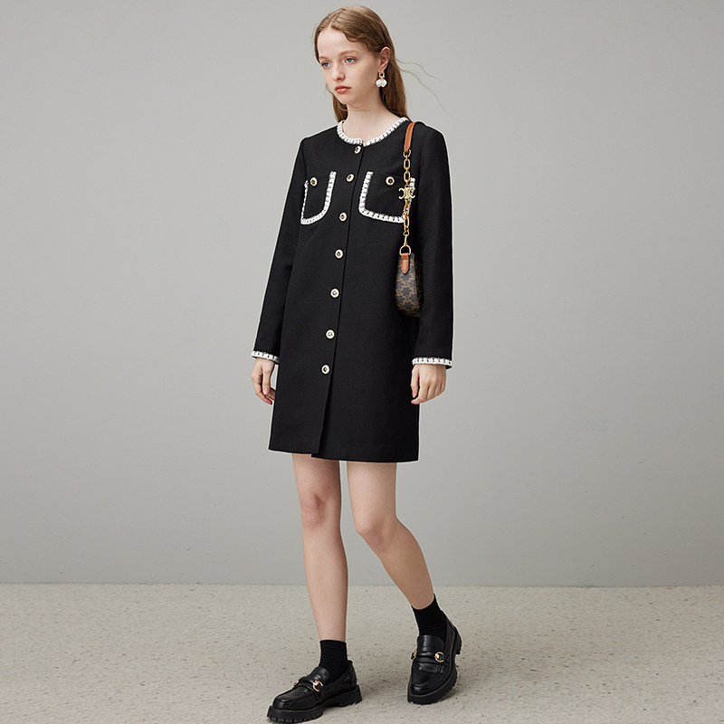dfvc春季黑色小香风连衣裙女2026新款撞色宽松直筒小个子小黑裙子