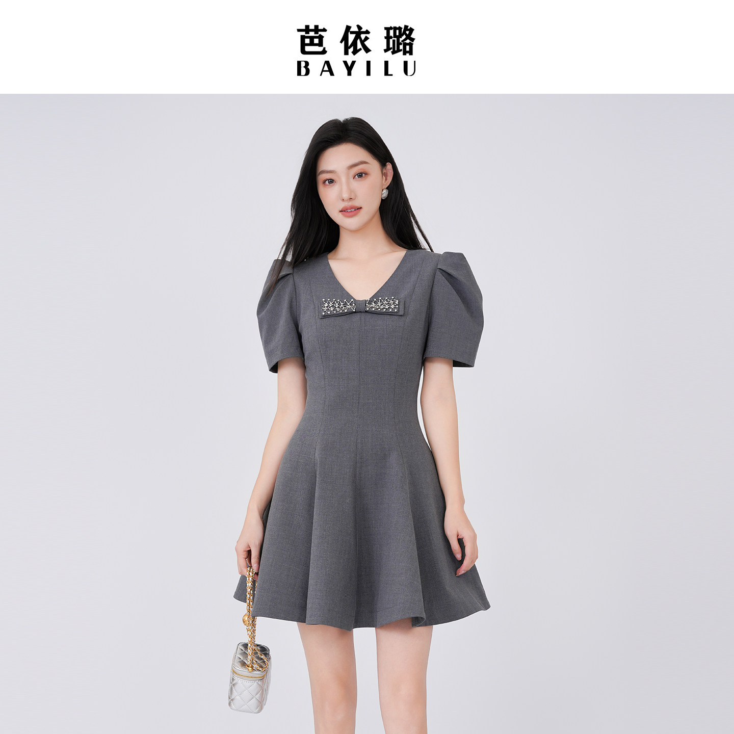 芭依璐2026春季新款连衣裙百搭气质收腰V领设计感小个子小香风裙