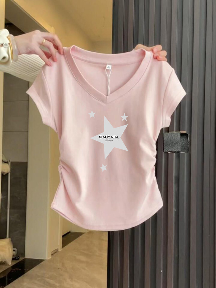 蓝色v领抽褶短袖t恤女款夏季星星印花正肩修身显瘦短款体恤小上衣