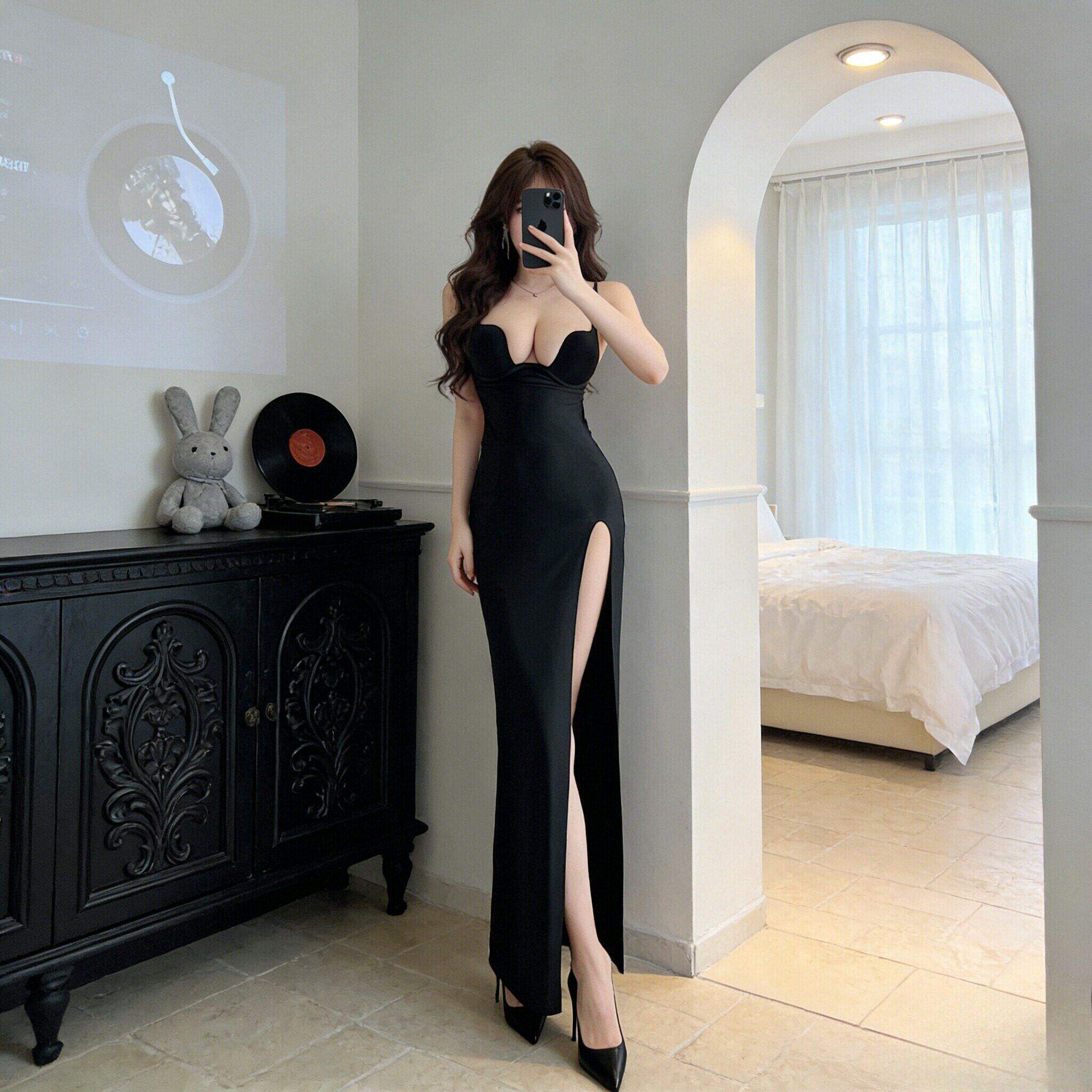 黑色吊带连衣裙女V收腰显瘦高开叉长款气质名媛宴会晚礼服裙子女