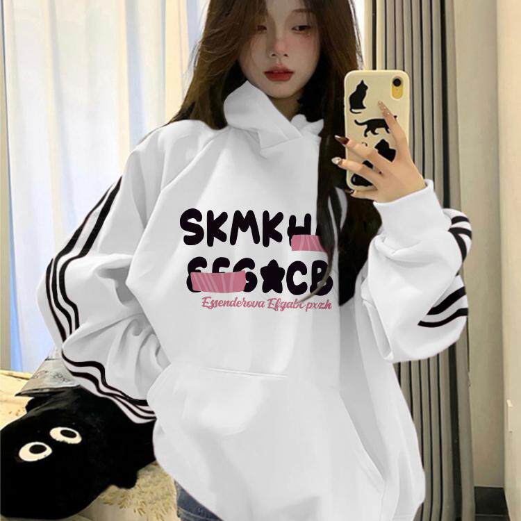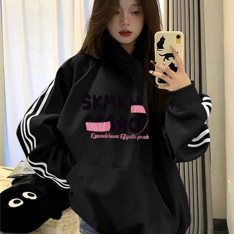 加绒加厚连帽三条杠外套粉色宽松潮牌chic卫衣女款2026秋冬装新款