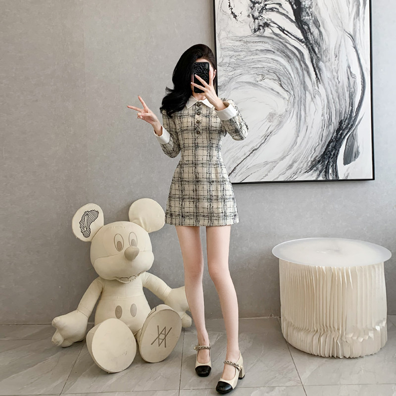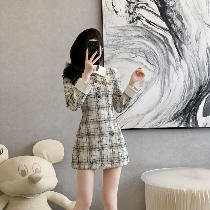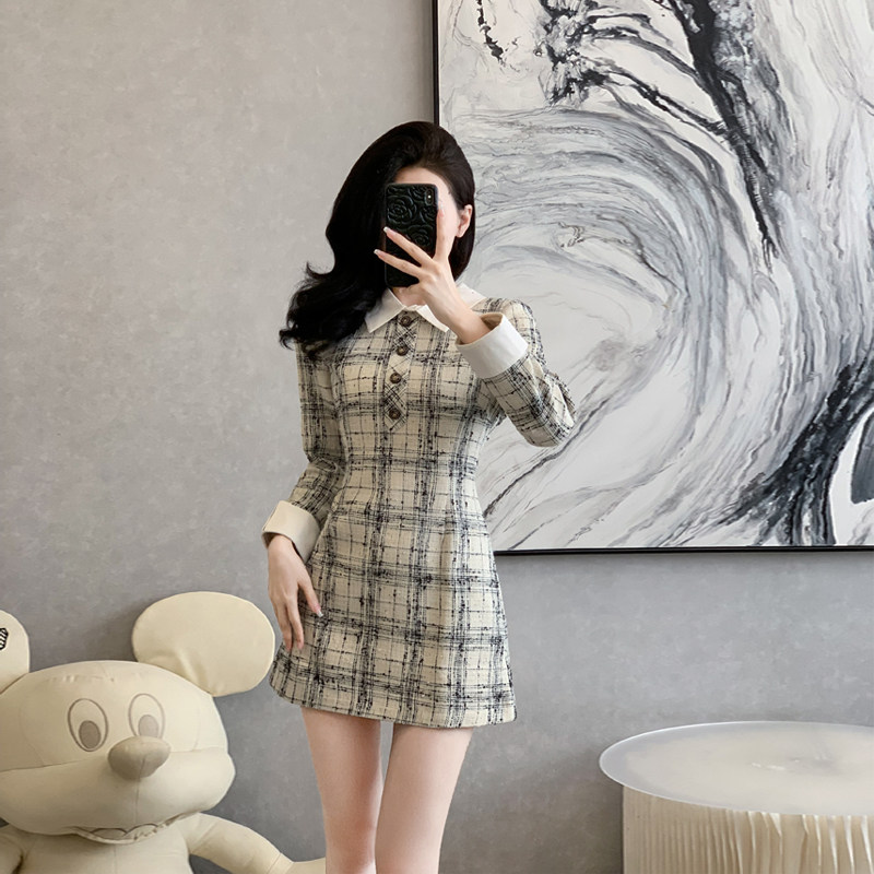 小香风长袖连衣裙女秋季法式名媛气质粗花呢A字收腰格子裙小个子