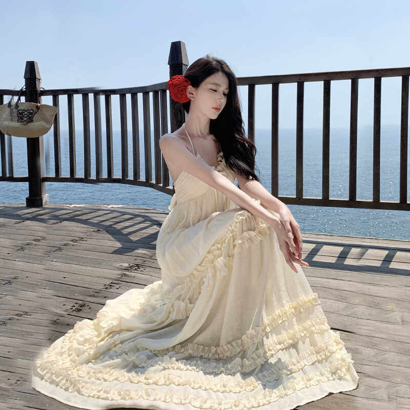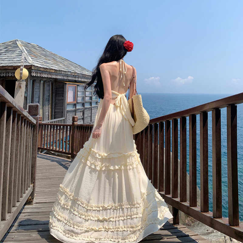 海边沙滩绝美连衣裙吊带度假长裙白色仙女拖地拍照高级挂脖沙滩裙