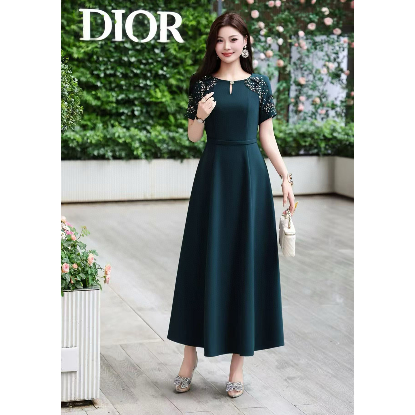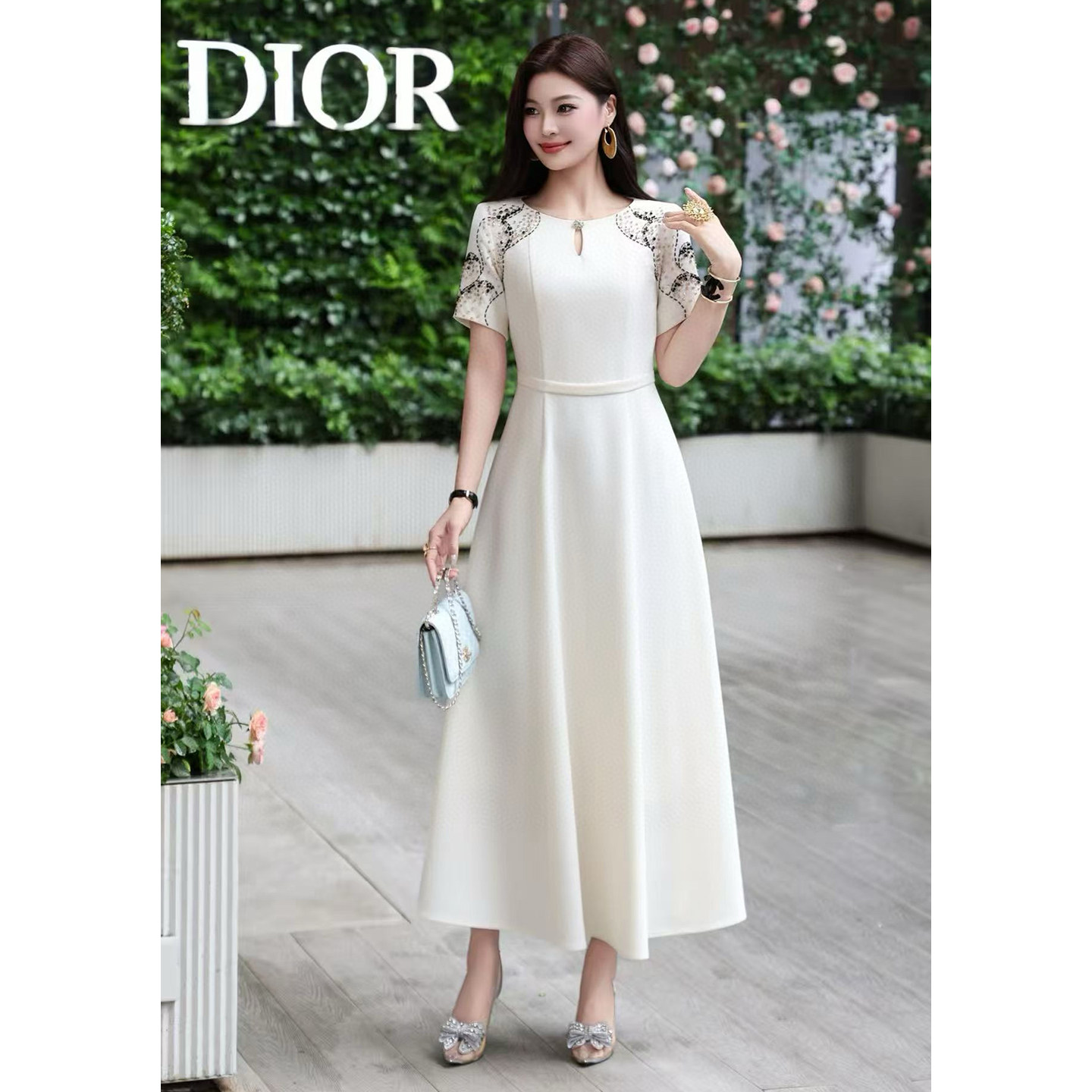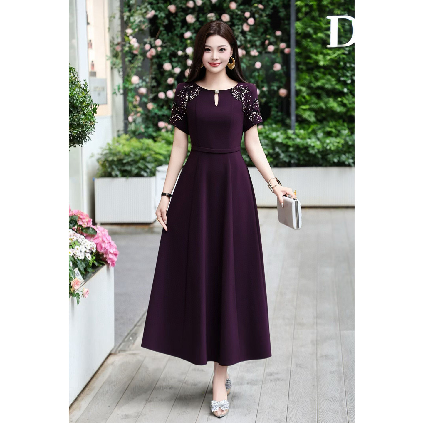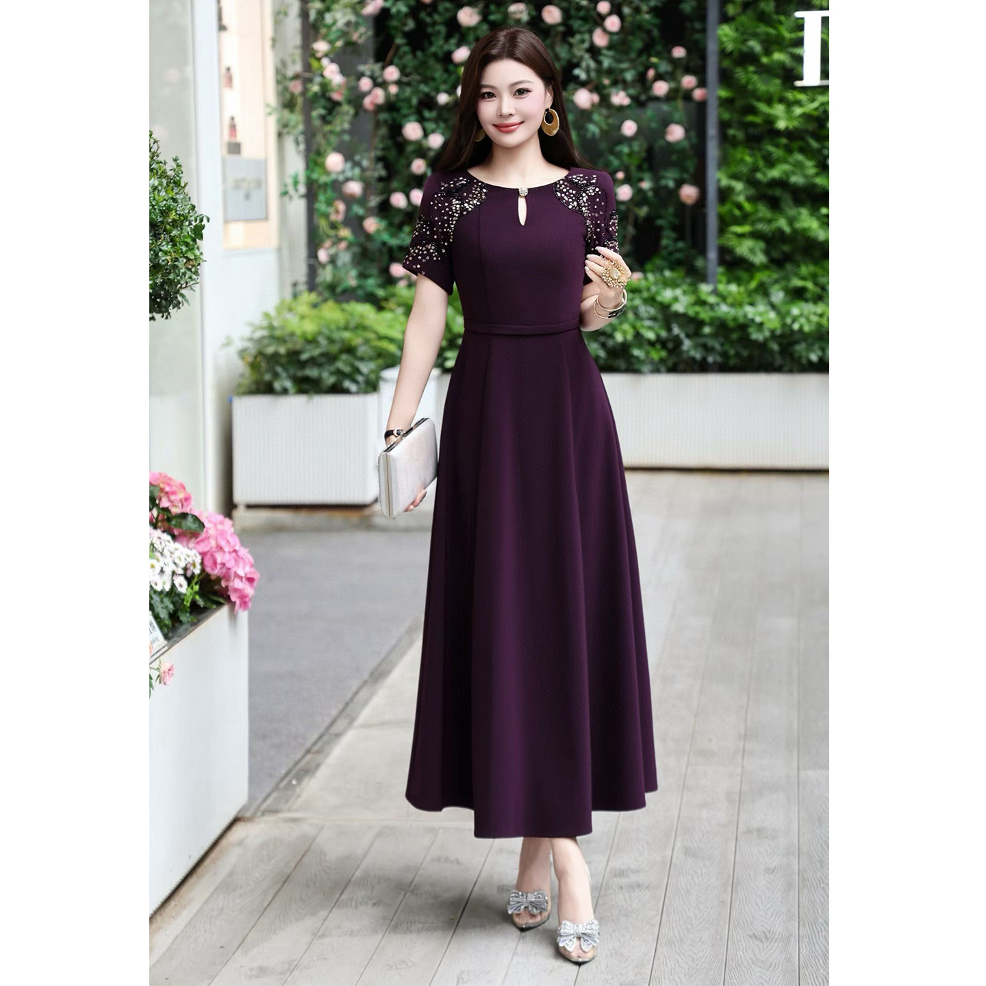 轻奢气质刺绣短袖连衣裙女收腰大摆长裙高级感婚宴礼服平时可穿夏