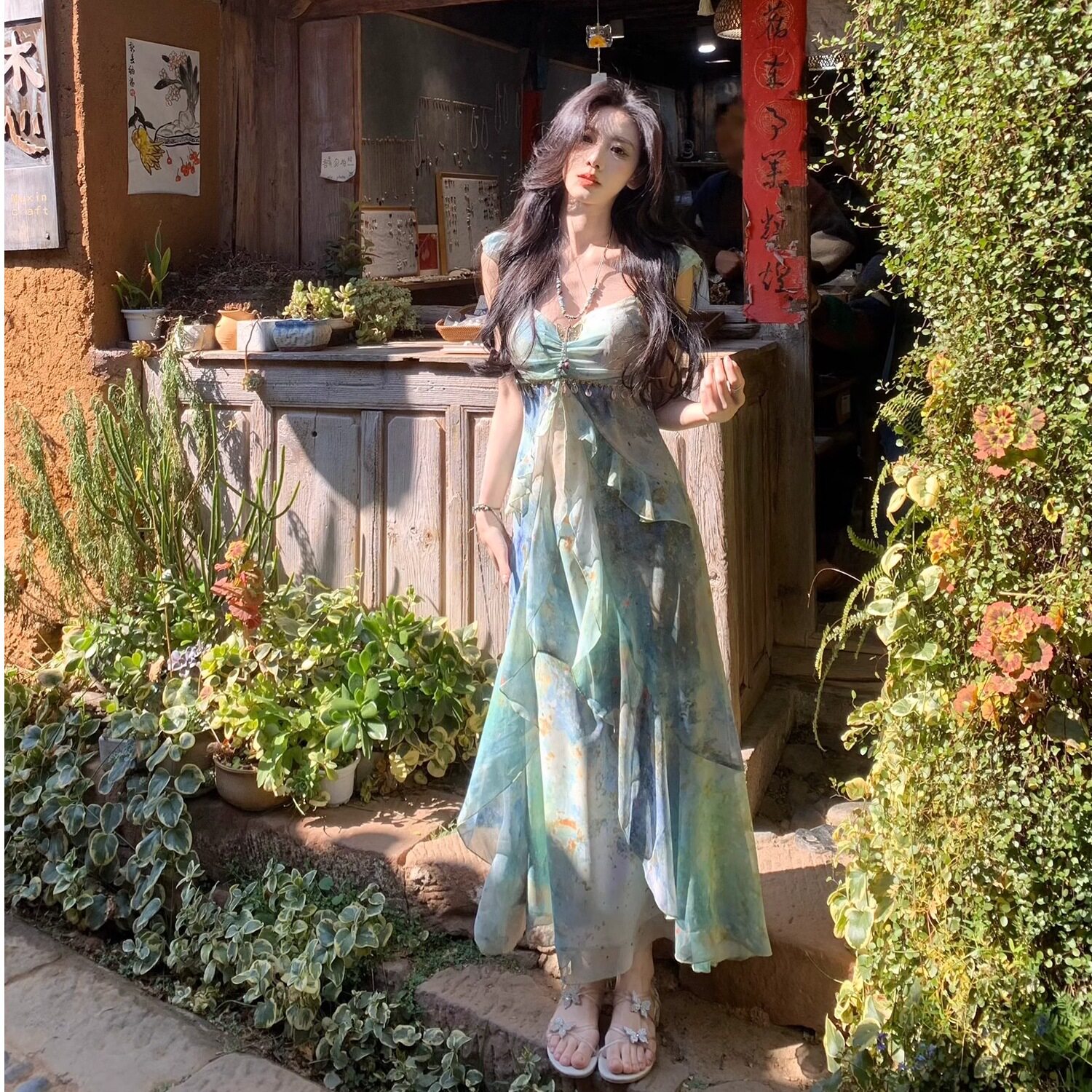 法式碎花吊带连衣裙女中长款夏季2026新款小个子高级感度假雪纺裙