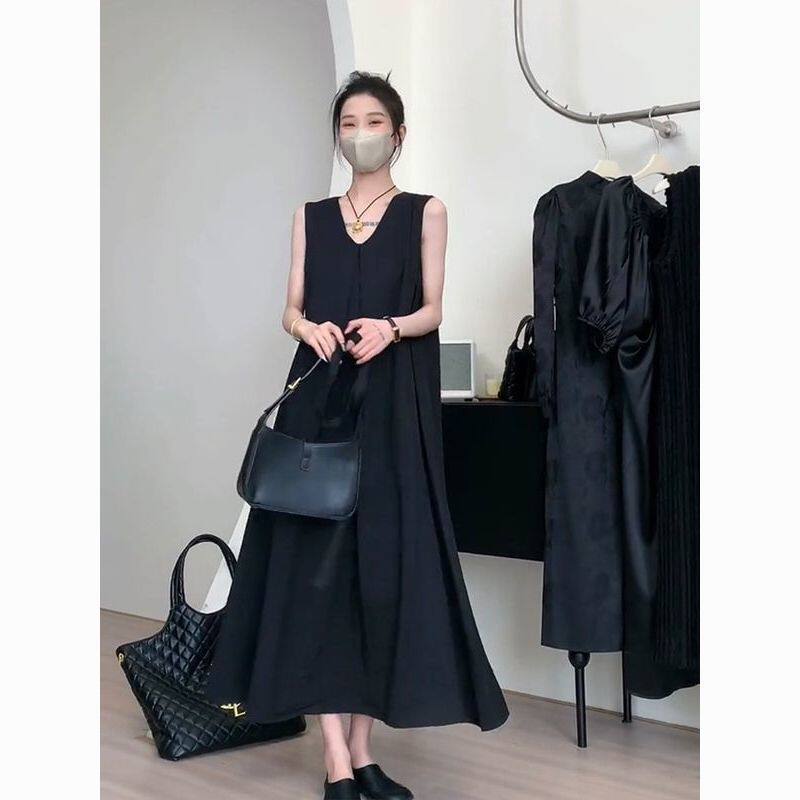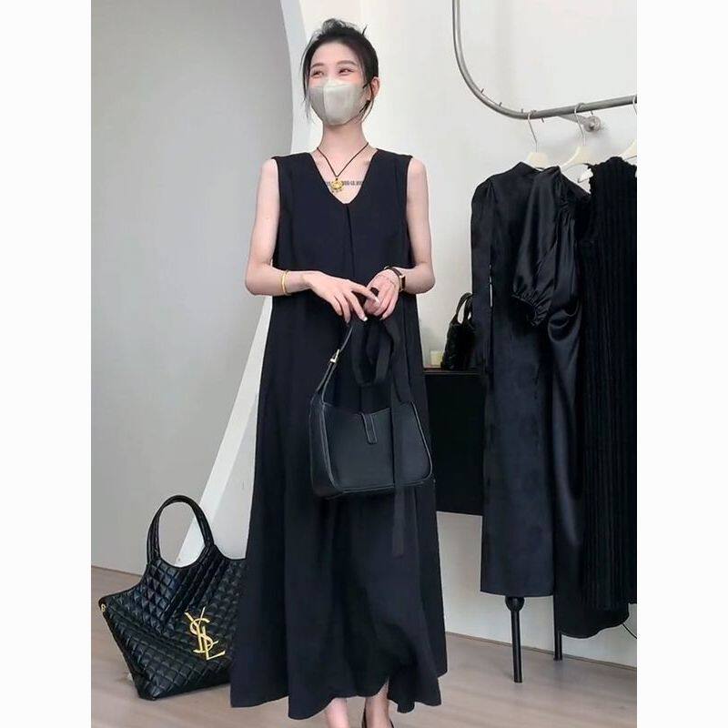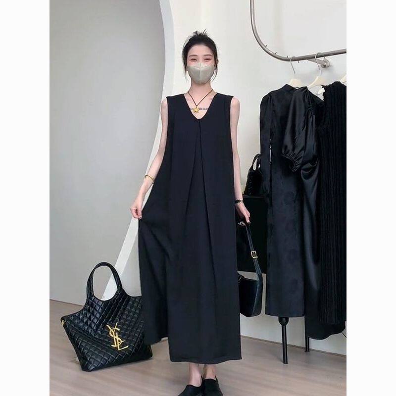 大码法式黑色v领无袖连衣裙女夏季胖mm2-300斤宽松显瘦遮肚子长裙