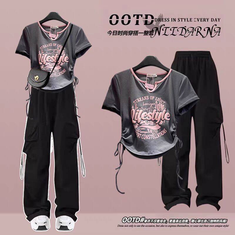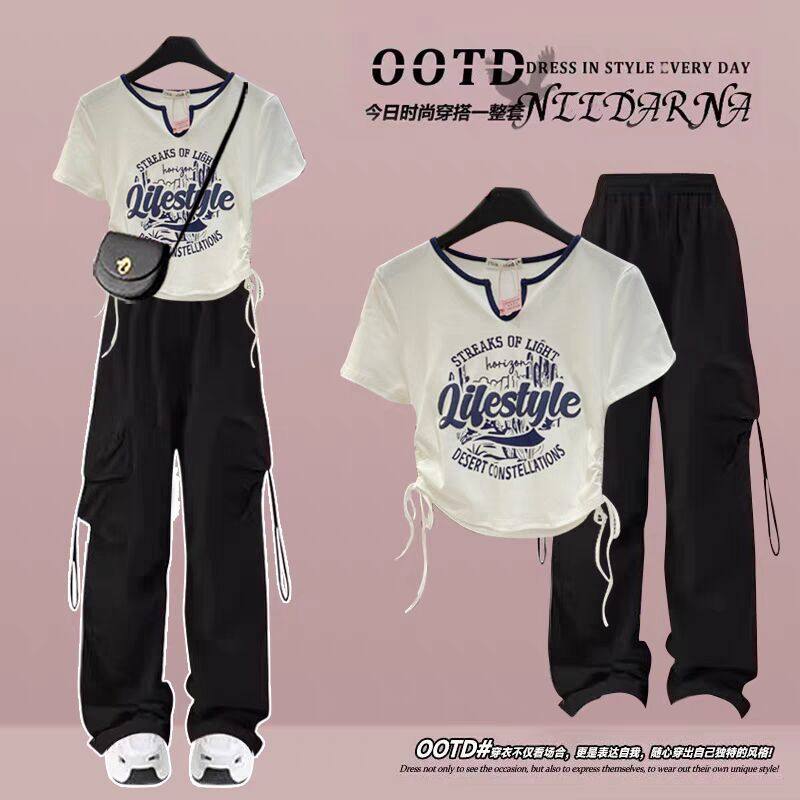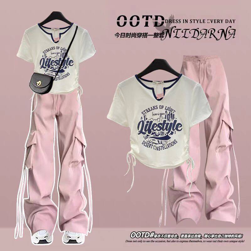 女童夏季工装裤套装2026新款潮酷正肩短袖中大童多巴胺运动两件套