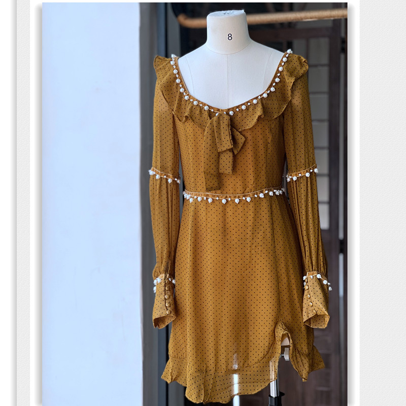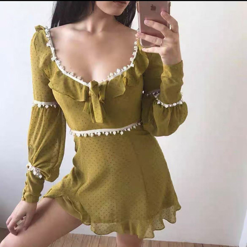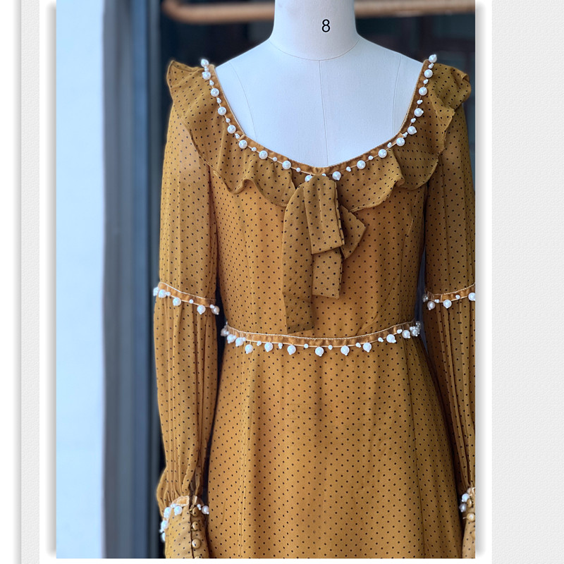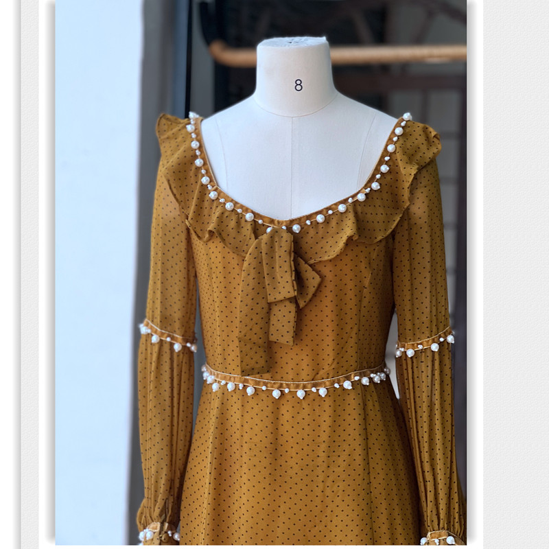 美式甜辣小个子女生连衣裙 雪纺钉珠镶边少女可爱方领长袖春夏款