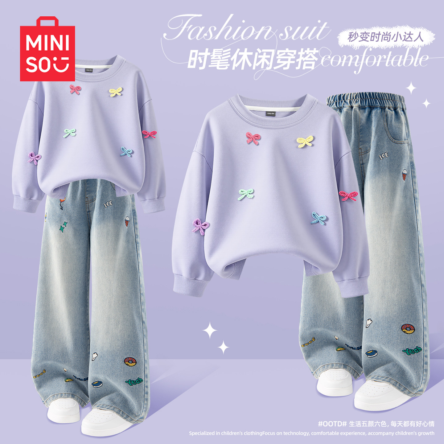 名创优品女童套装2026新款春秋蝴蝶结卫衣薄款女孩牛仔裤儿童春装