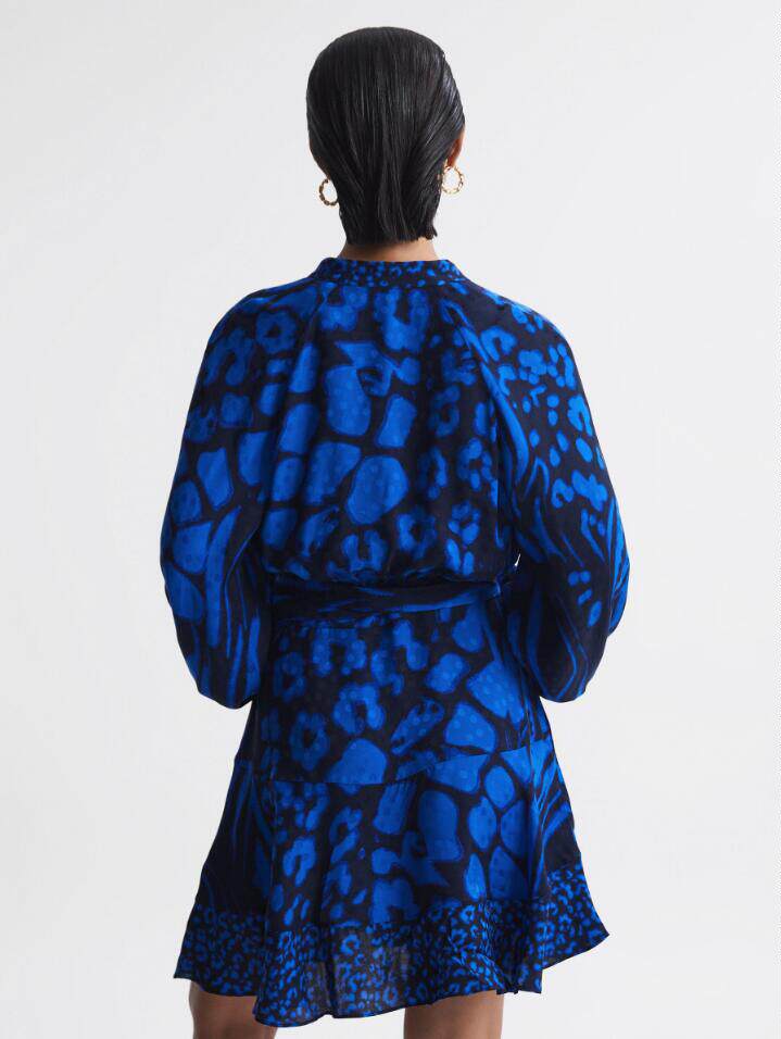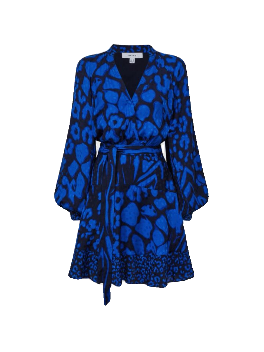 REISS长袖连衣裙蓝色印花短款系带V领优雅名媛英伦风气质百搭