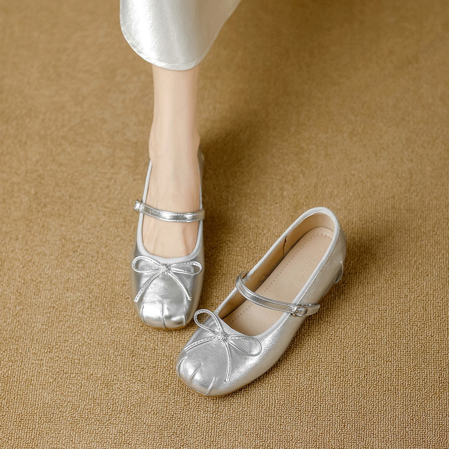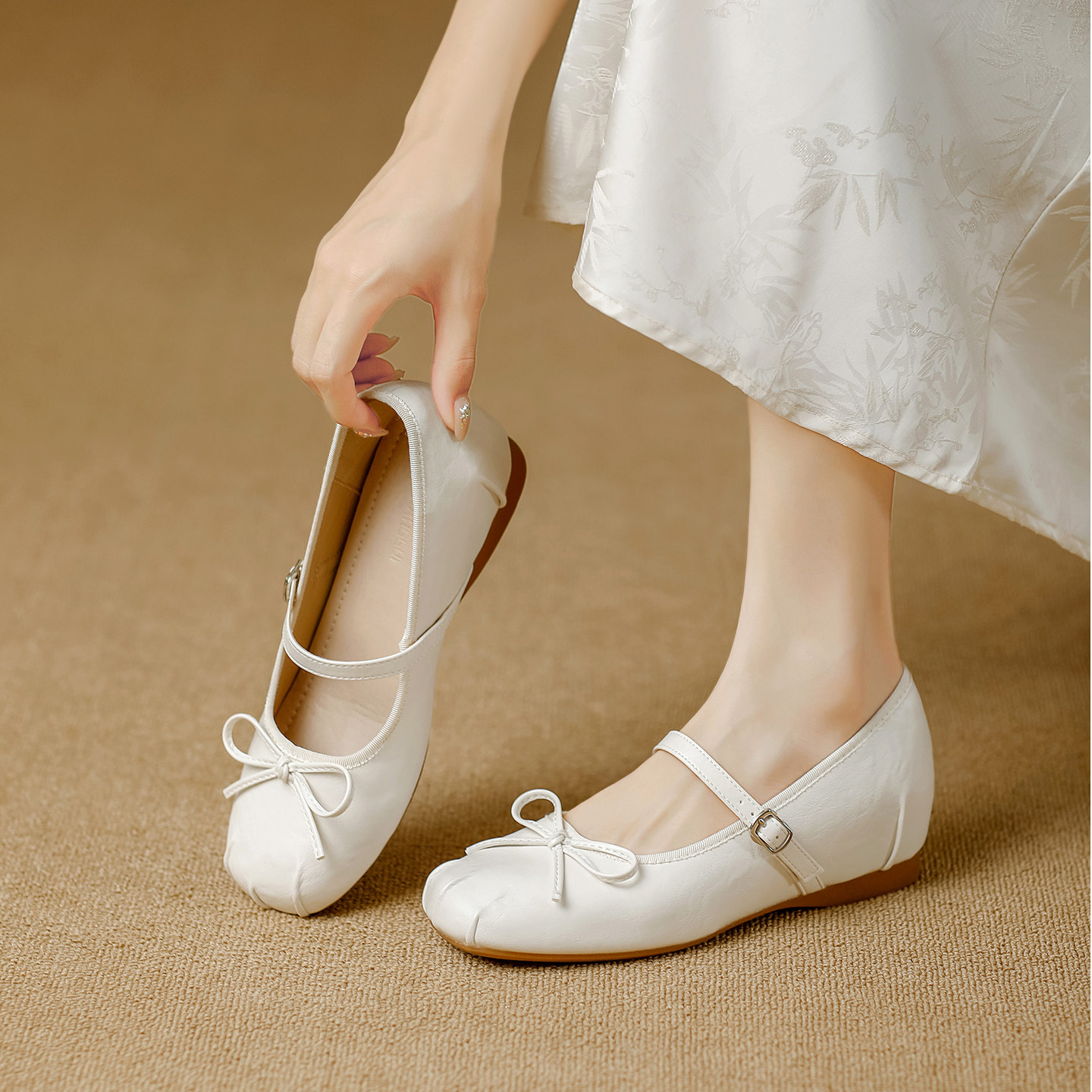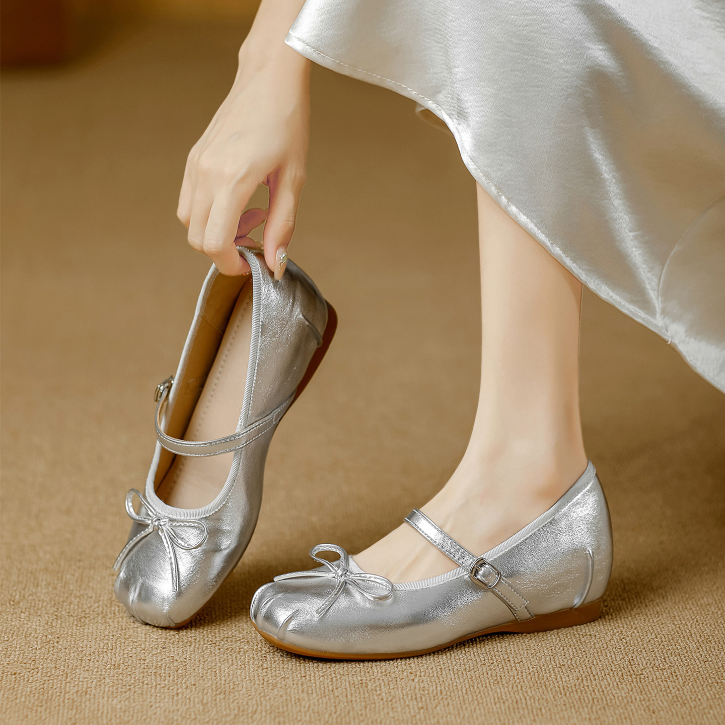 羊皮版~内增高白色单鞋女2025新款蝴蝶结芭蕾女鞋子方头玛丽珍鞋