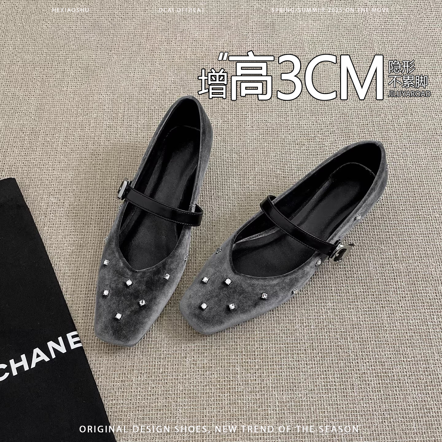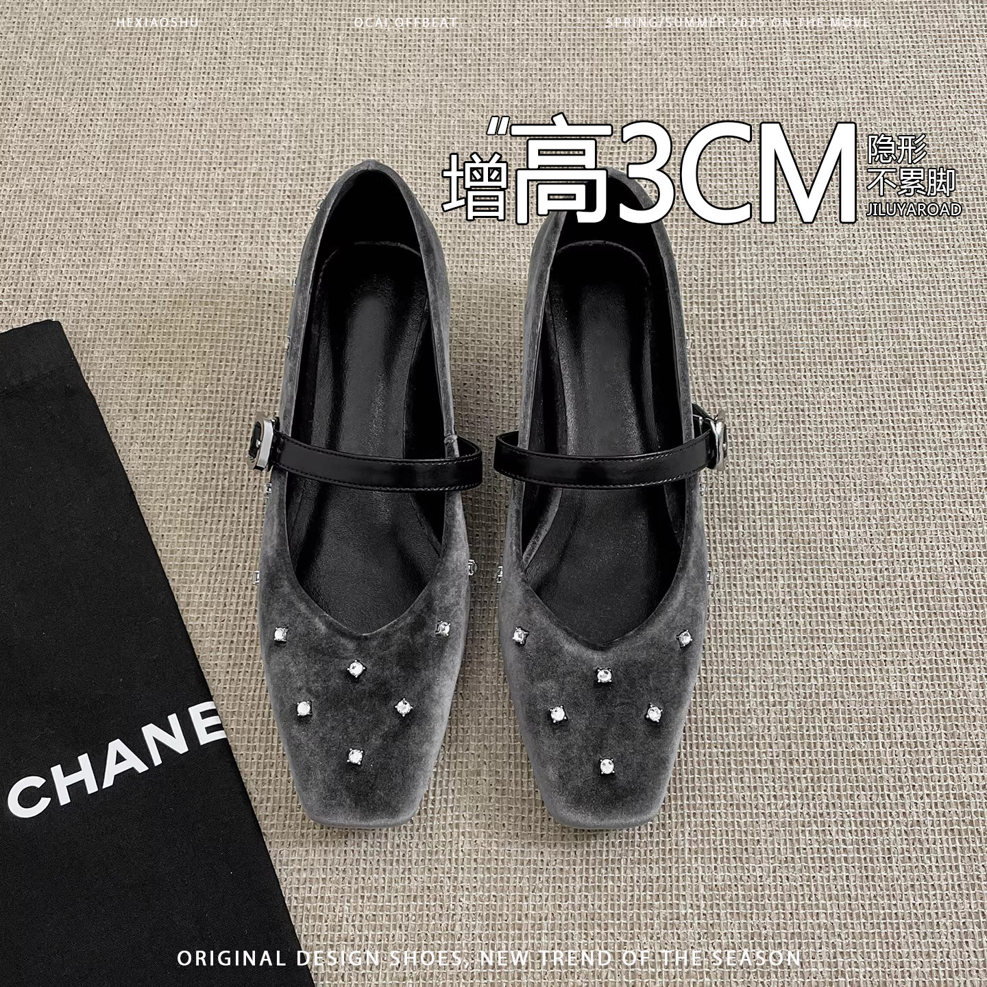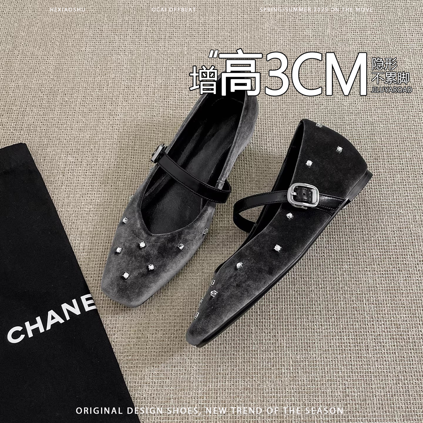 羊皮版法式内增高水钻绒面玛丽珍鞋女2026新款气质配裙子平底单鞋