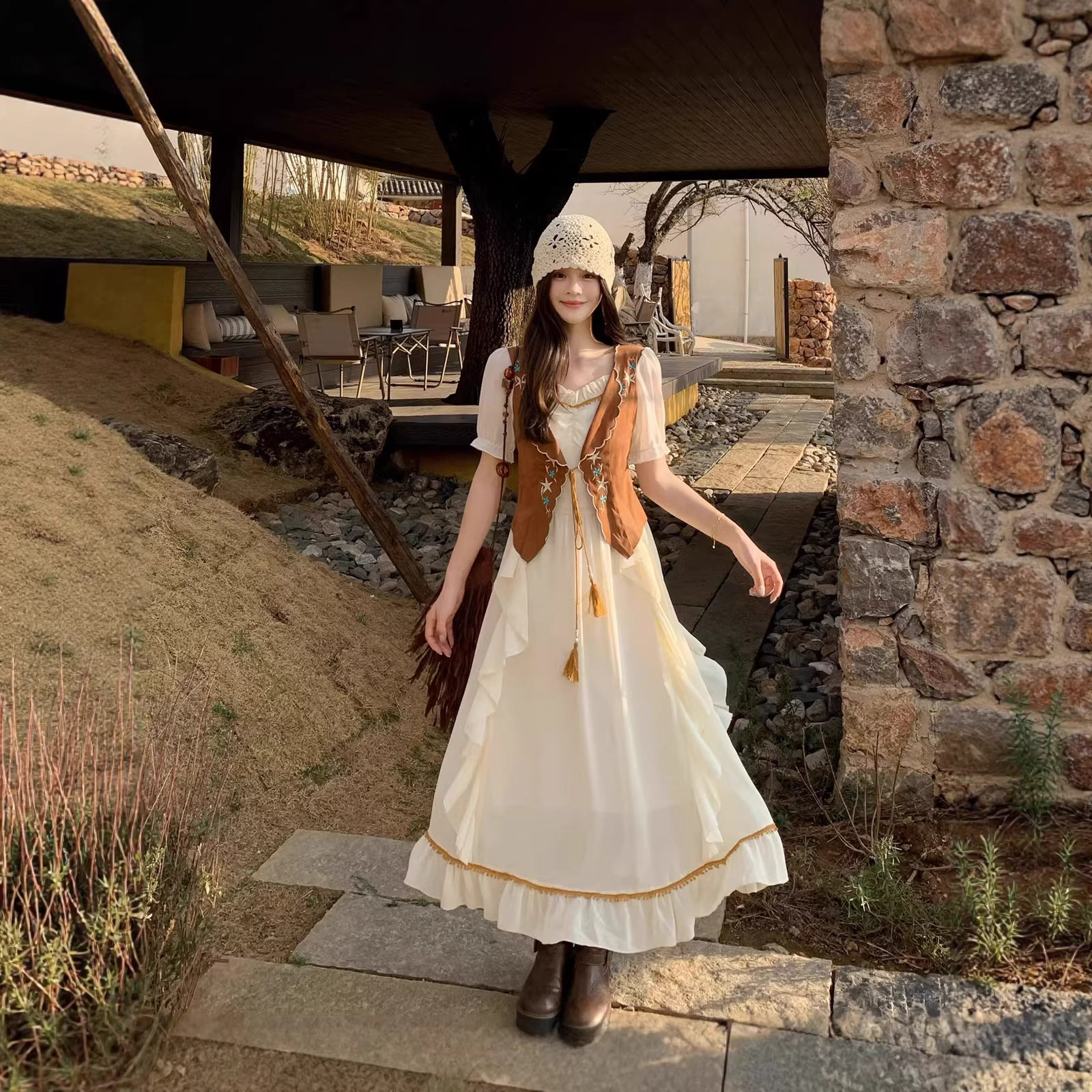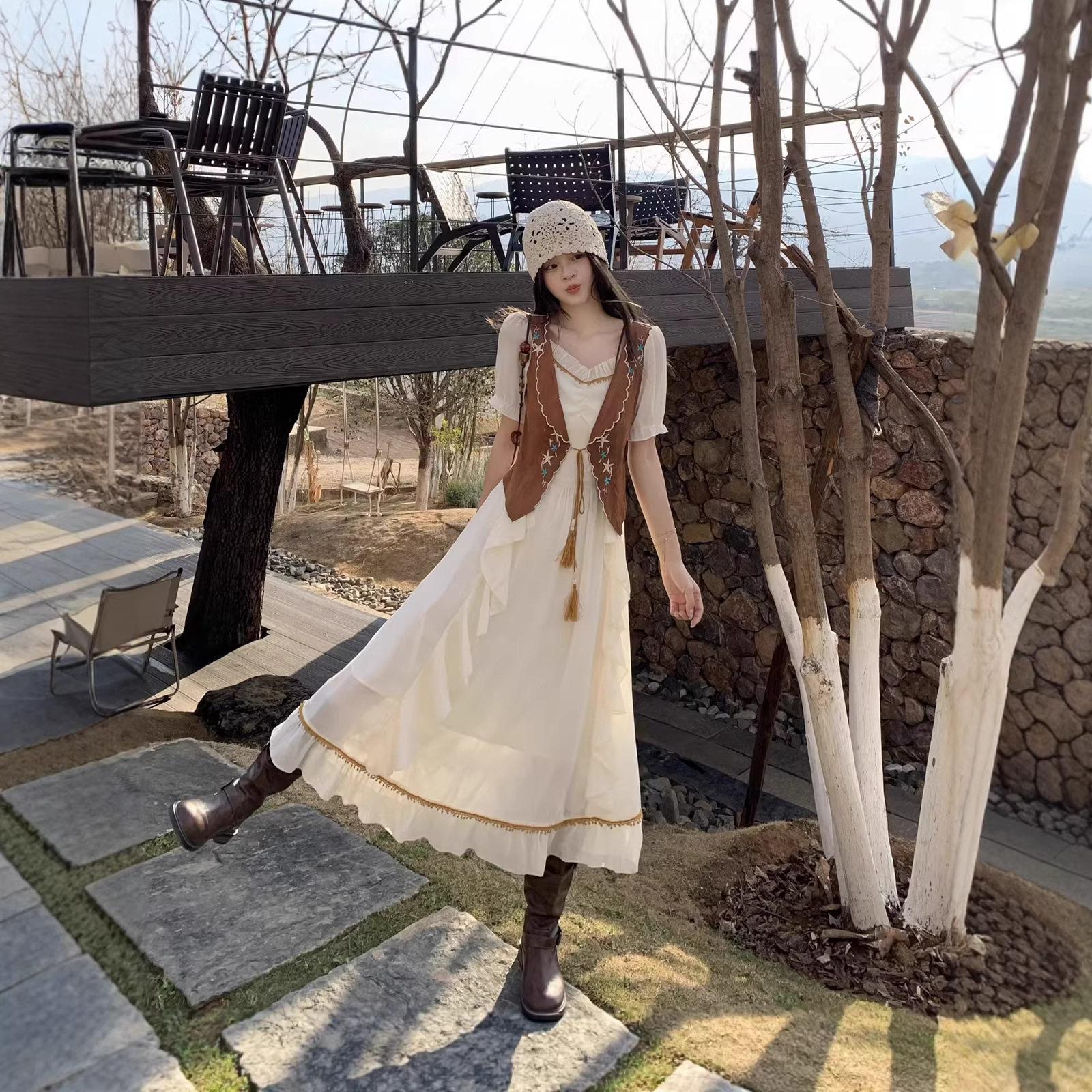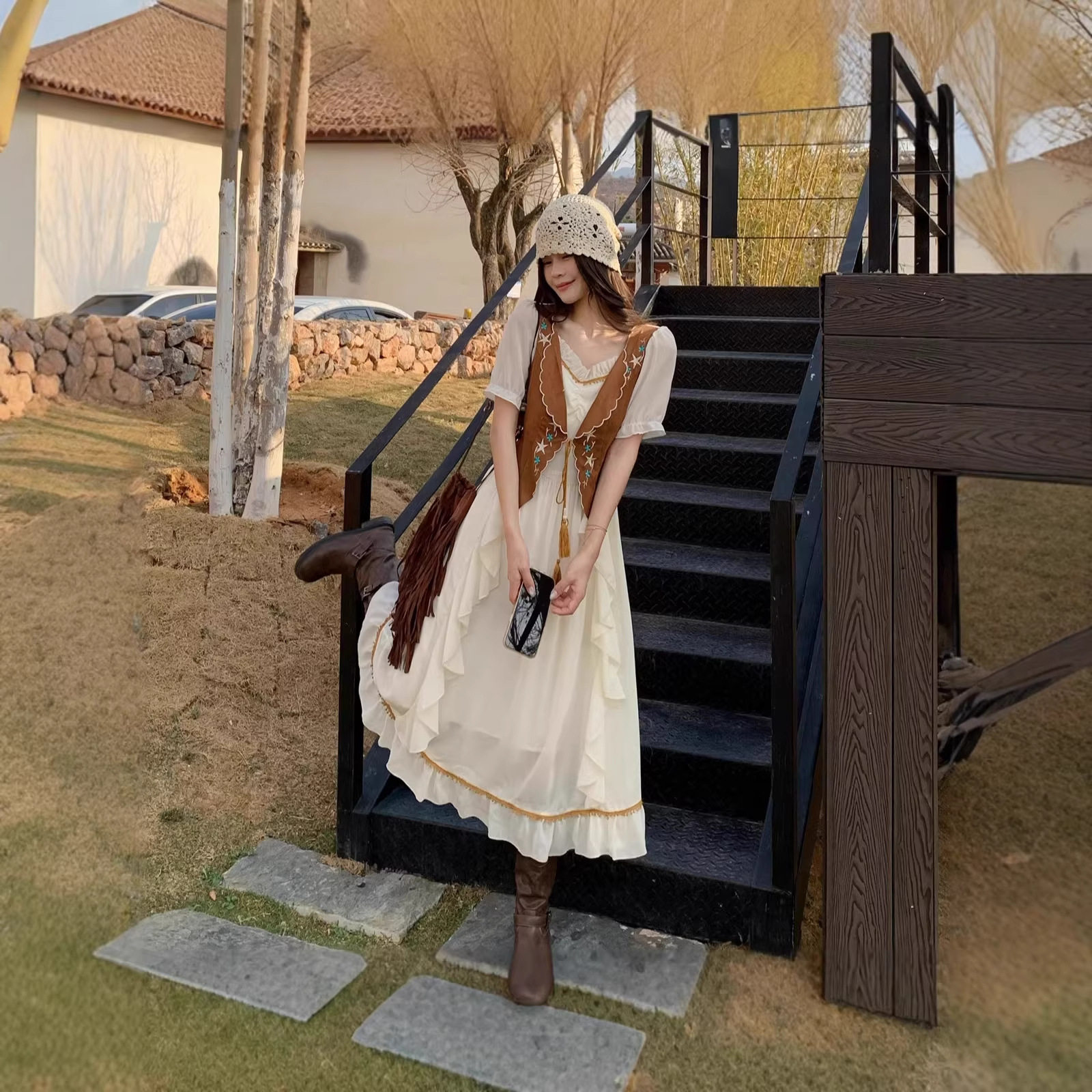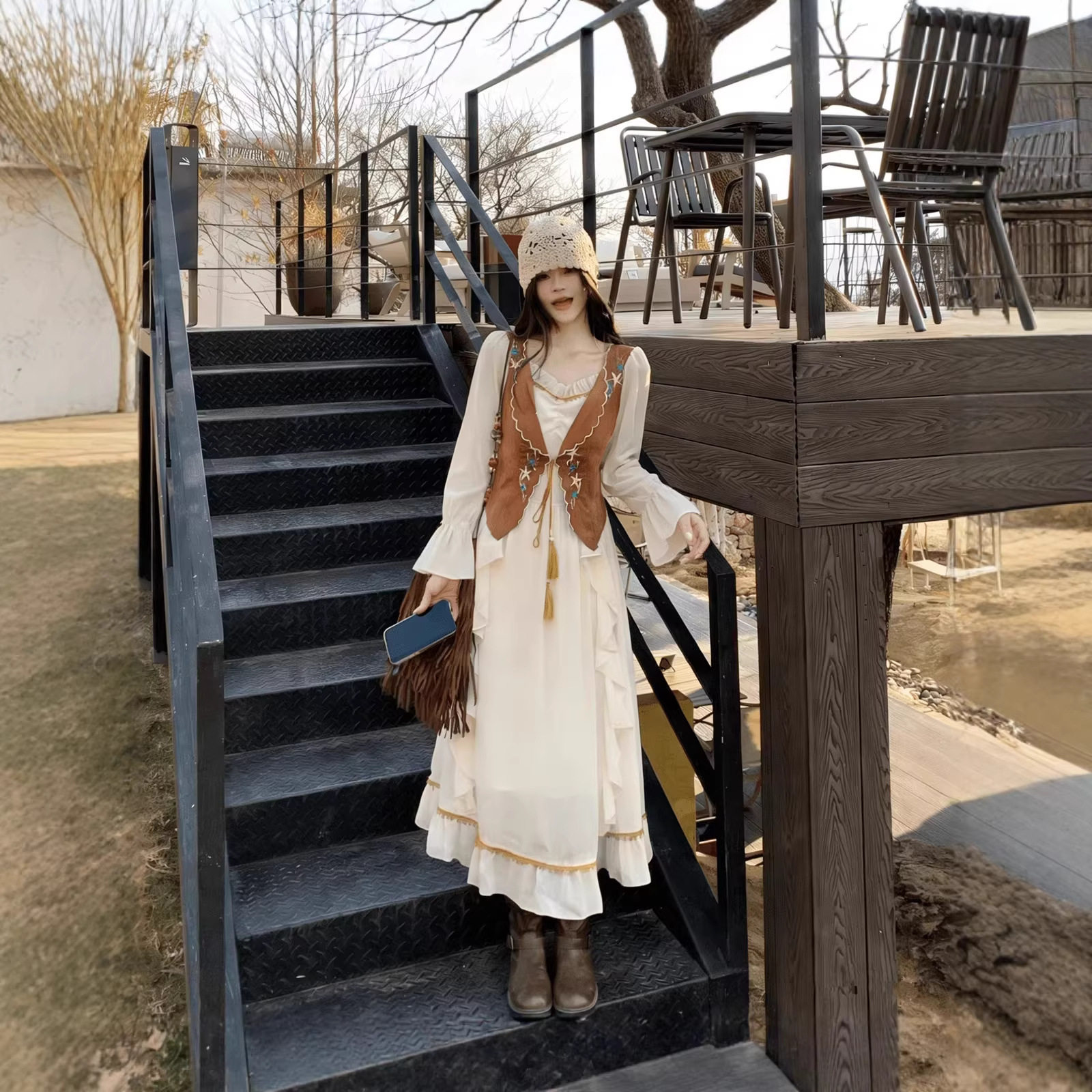 气质通勤风日常度假流苏V领刺绣假两件牛仔绒大摆长裙连衣裙A字裙