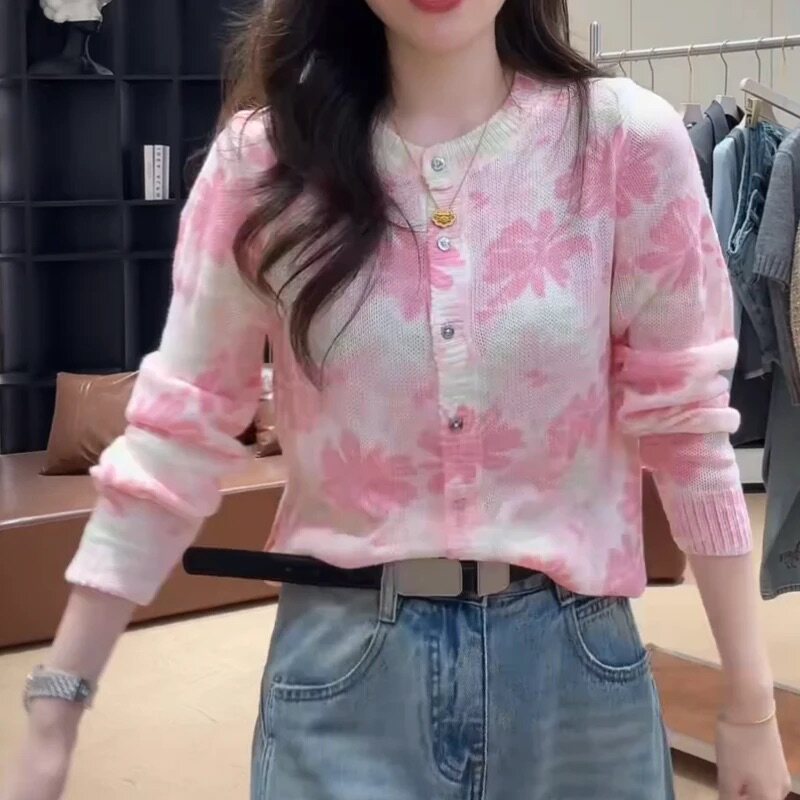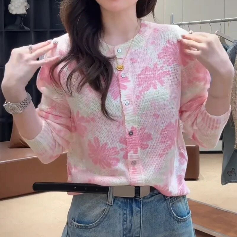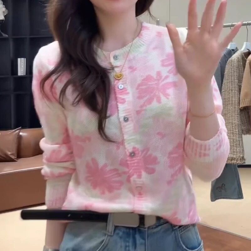 2026春季新款毛衣针织开衫女士高级感漂亮撞色花朵圆领上衣10072