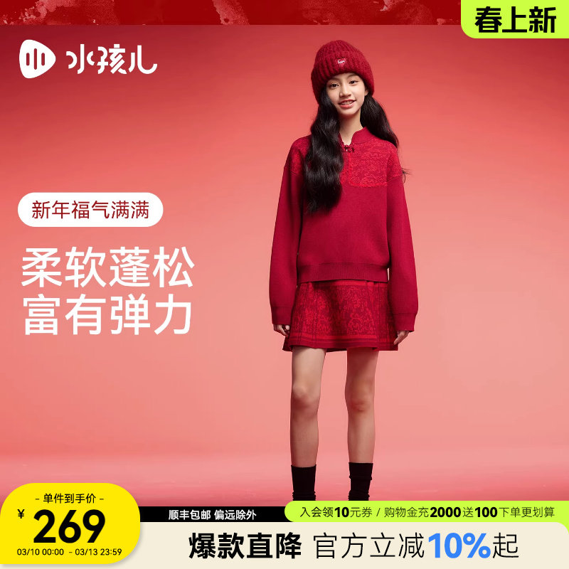 水孩儿女童套装2026春装新品新年红色毛衣半身裙大童针织两件套