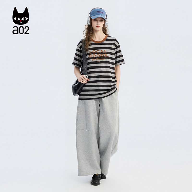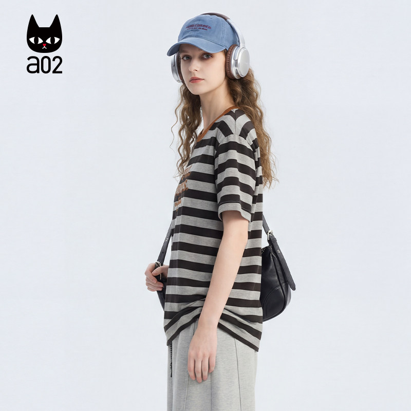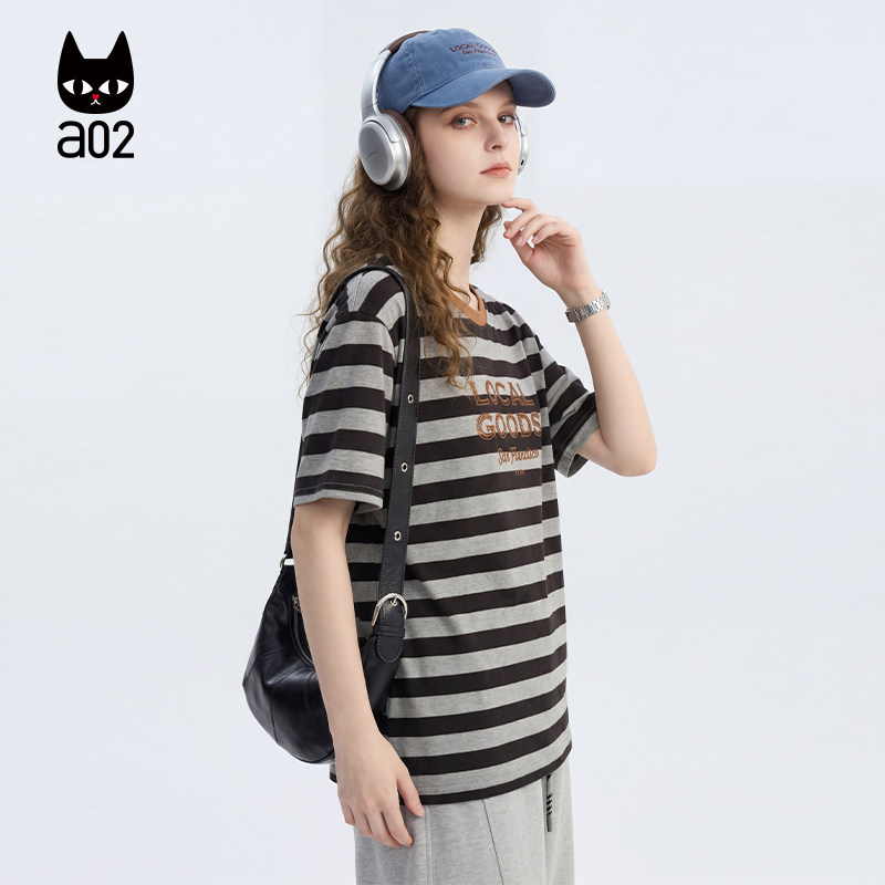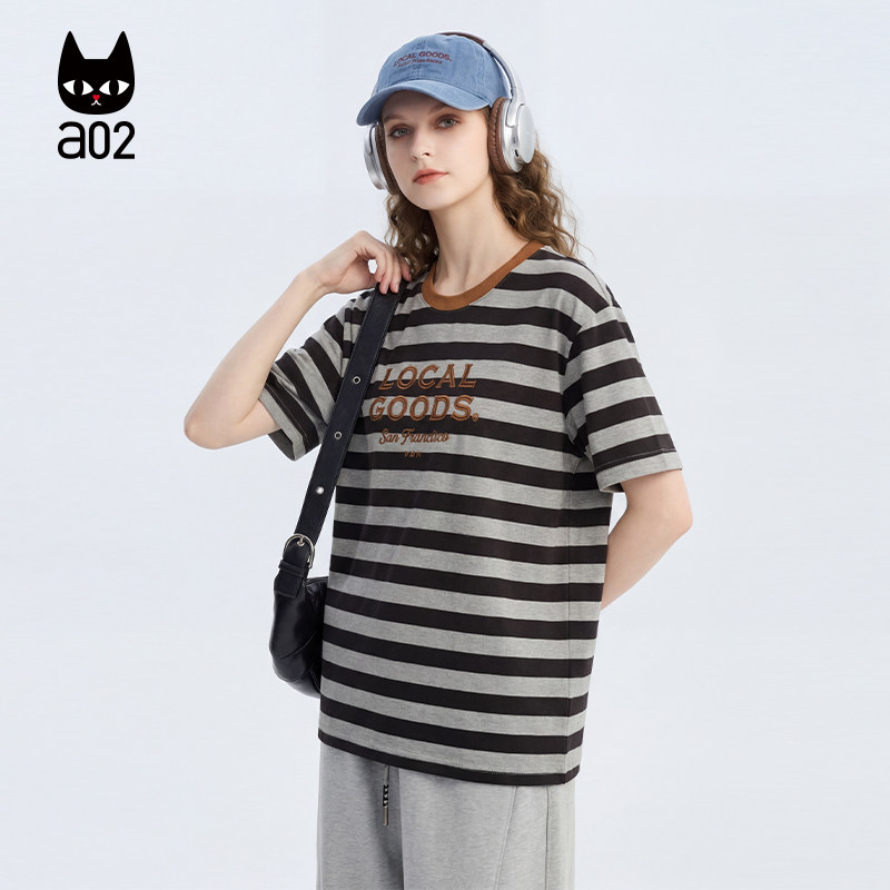 a02宽松复古条纹短袖T恤女款2026新款夏季圆领半袖上衣薄款透气