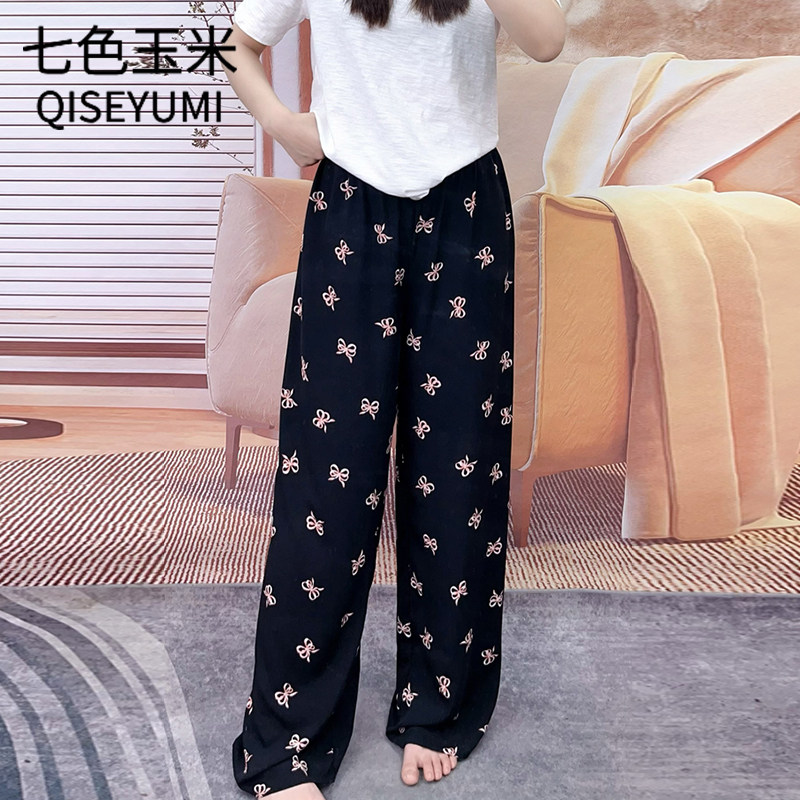 棉绸睡裤女士夏季薄款大码人造绵绸可外穿家居碎花长裤子直筒宽松