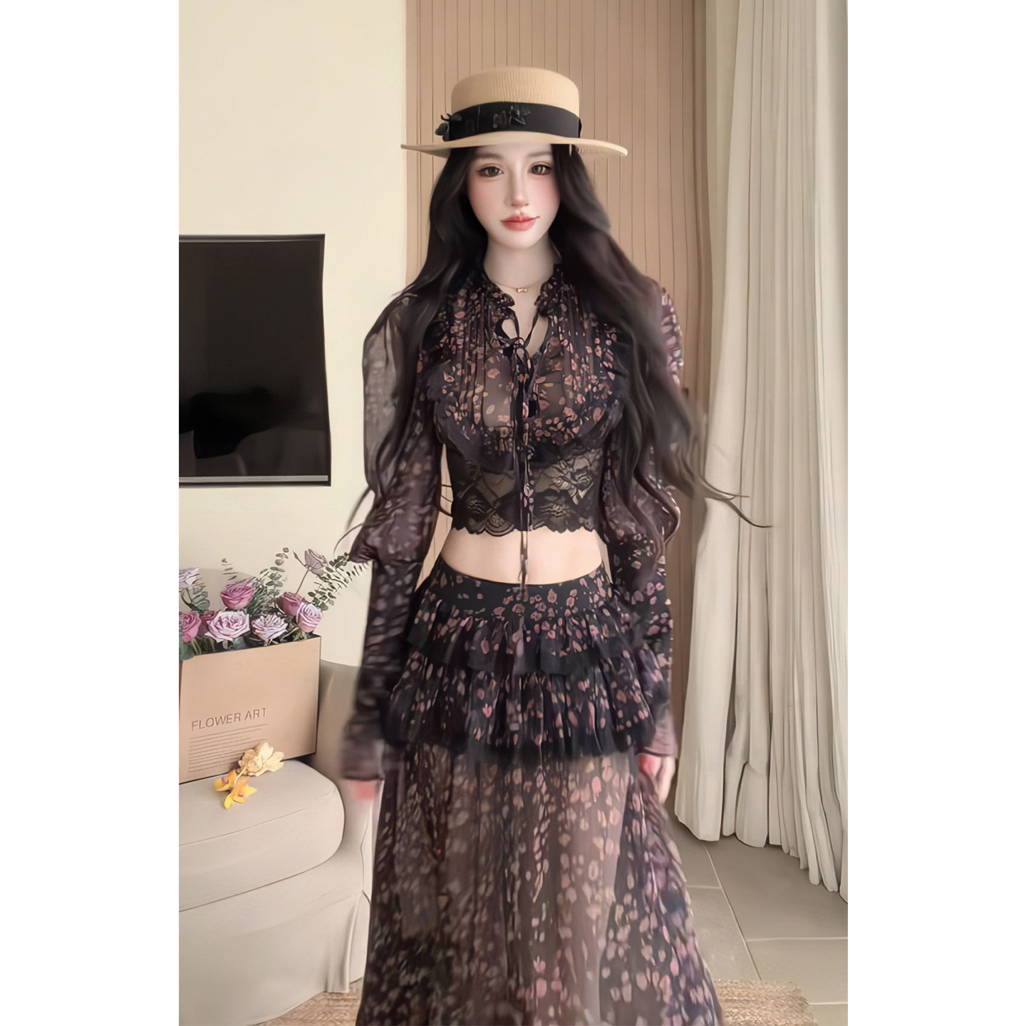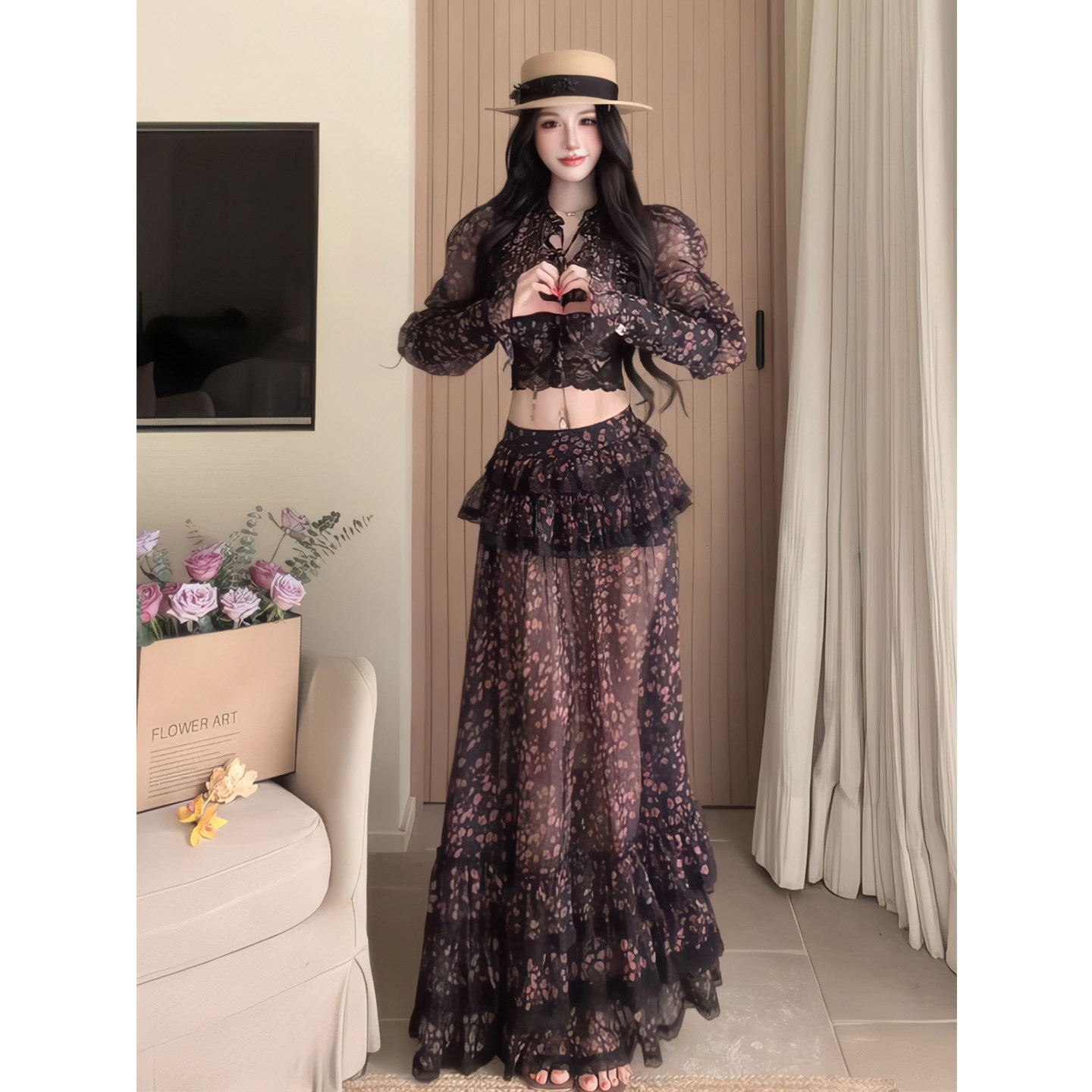现货!早春穿搭套装女装2026新款法式雪纺碎花上衣+半身裙两件套