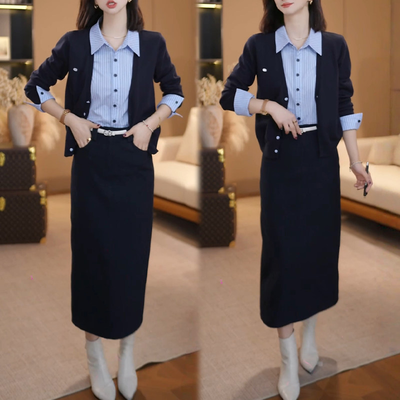 巨好看的早春一整套穿搭2026新款条纹假两件针织衫直筒半身裙套装